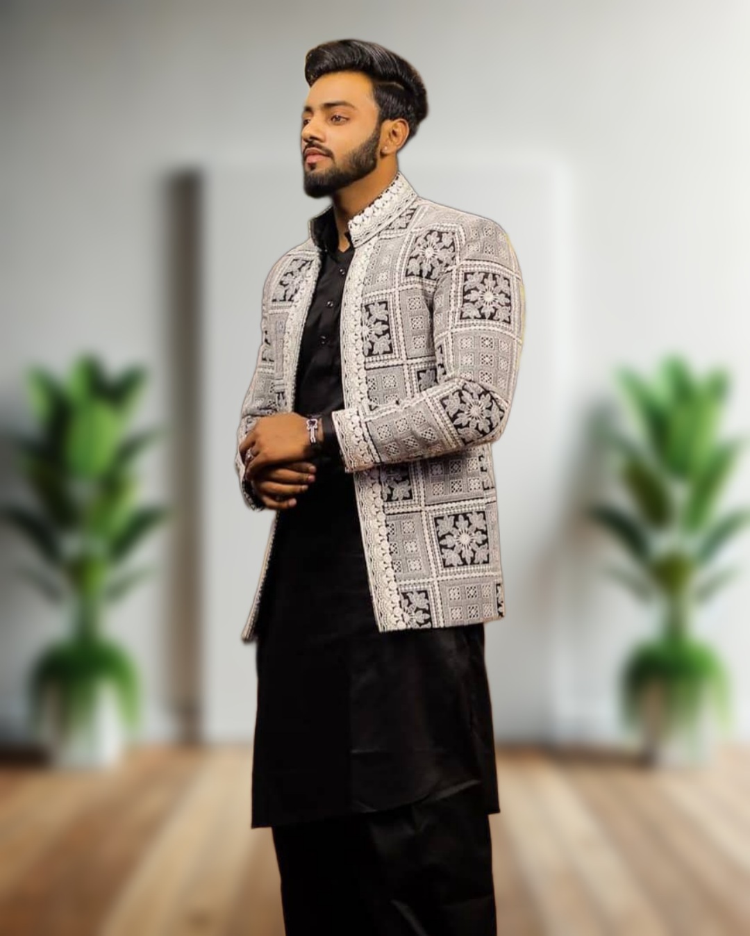 The luxury open jacket design enhances your overall look with its royal charm and sophisticated silhouette, making it ideal for grooms or anyone looking to make a lasting impression. This exclusive Faisaloutfits creation reflects the brand’s commitment to luxury, authenticity, and craftsmanship, turning every occasion into a statement of style and class.