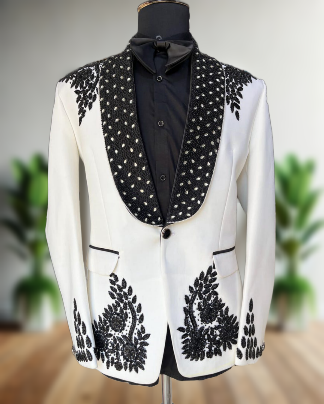 Crafted from luxury-quality fabric, the tuxedo features a smooth texture, rich finish, and elegant drape that reflects high-end tailoring standards. The designer blazer showcases refined lapel detailing, precision stitching, and a structured fit, while the waistcoat adds a layer of sophistication and depth. The tailored trousers ensure comfort, flexibility, and a flawless finish throughout long celebrations.