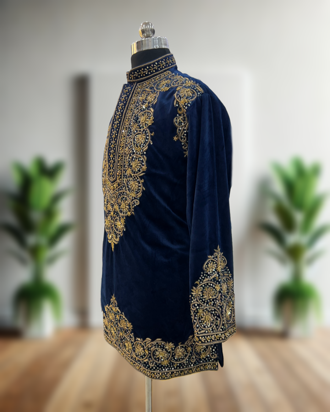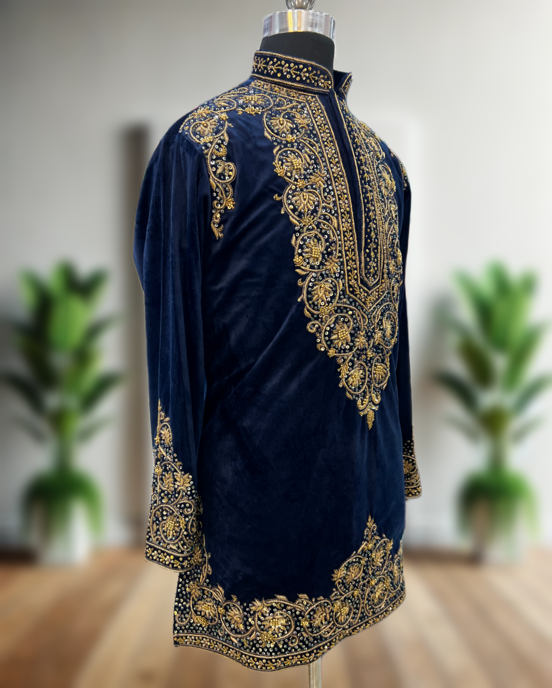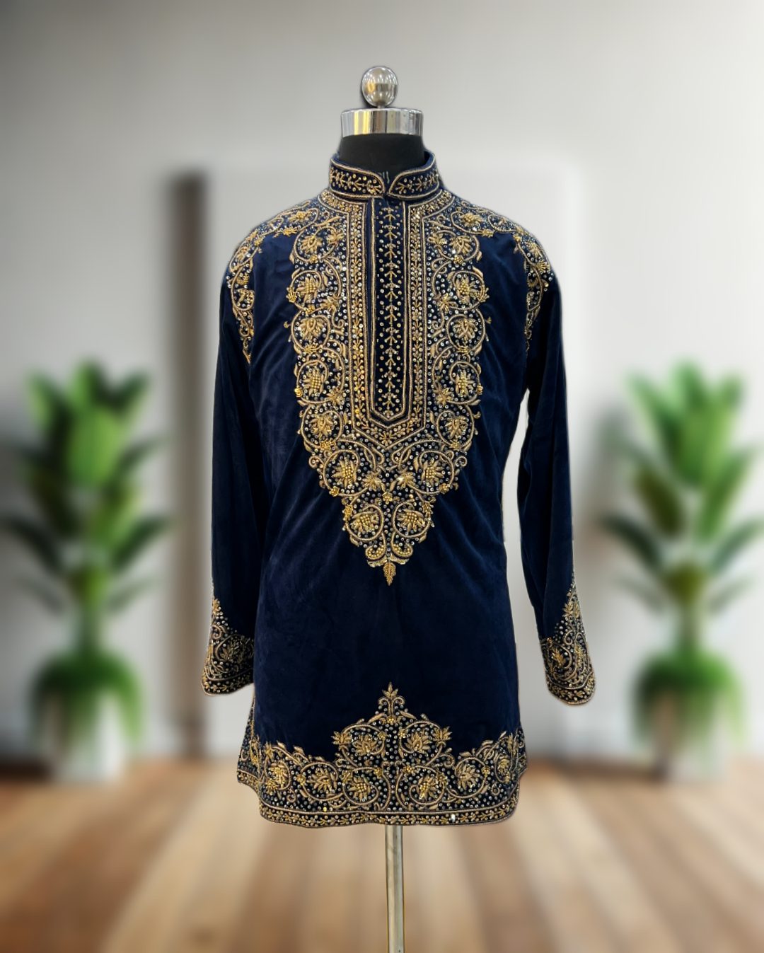 Expertly handcrafted by skilled artisans, this exclusive set showcases fine tailoring, precise stitching, and thoughtful design details that enhance its regal appeal. The designer kurta features a structured yet graceful silhouette, offering an elegant fall and refined finish, while the matching pajama is tailored to provide a comfortable and polished look throughout long celebrations.