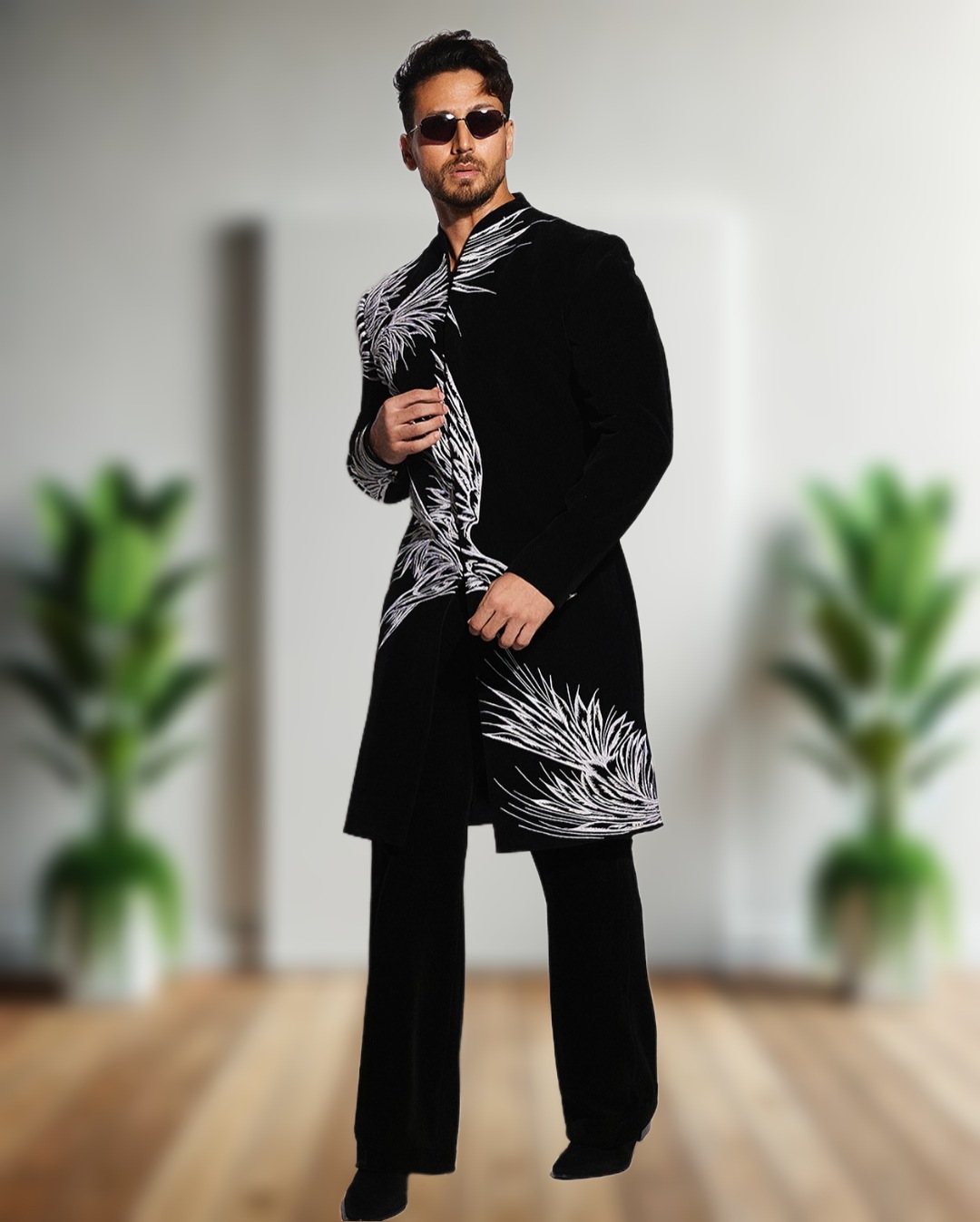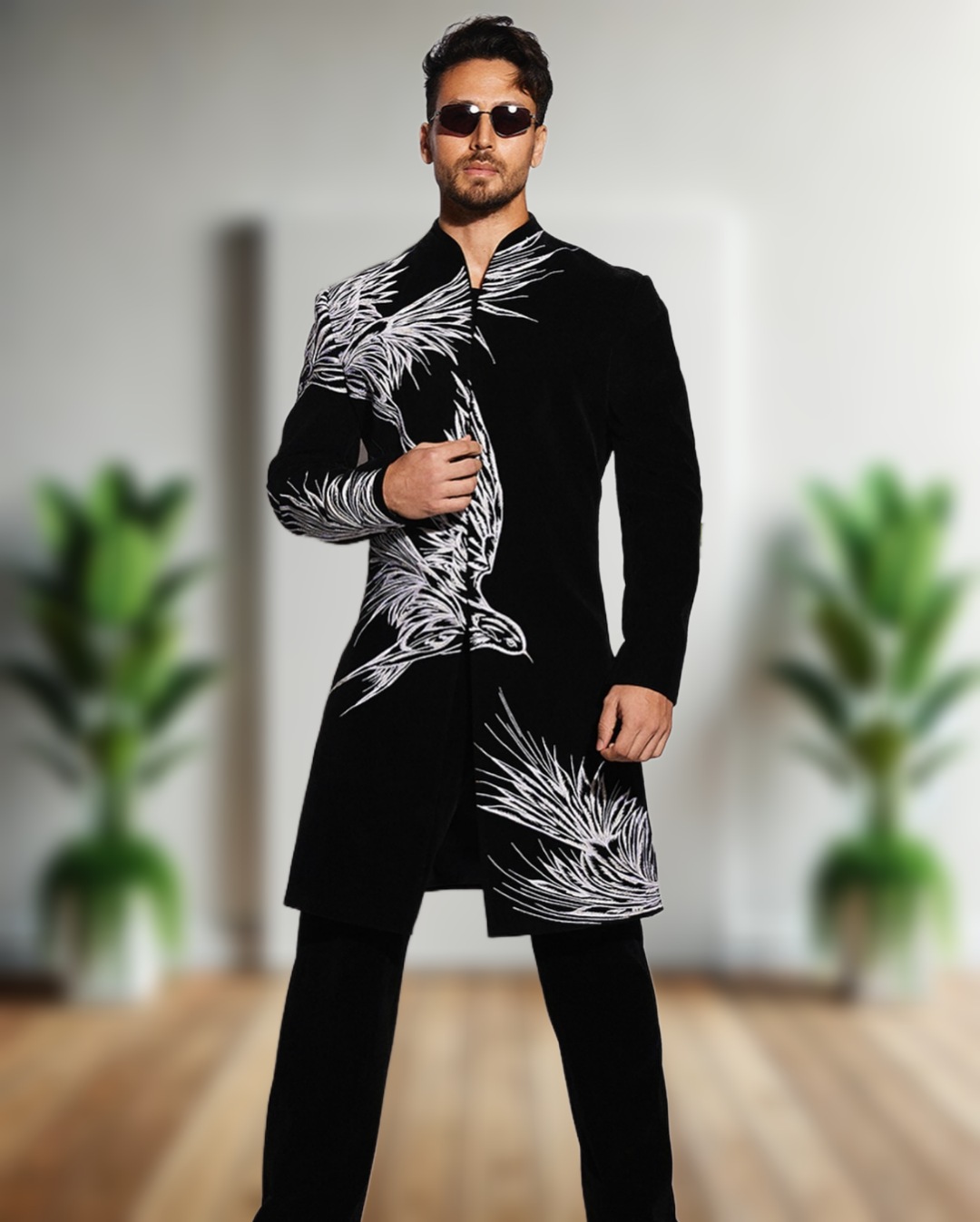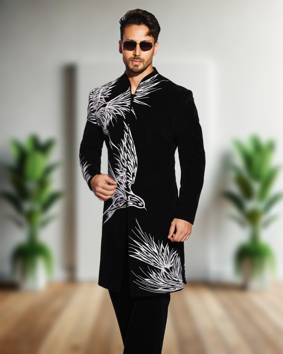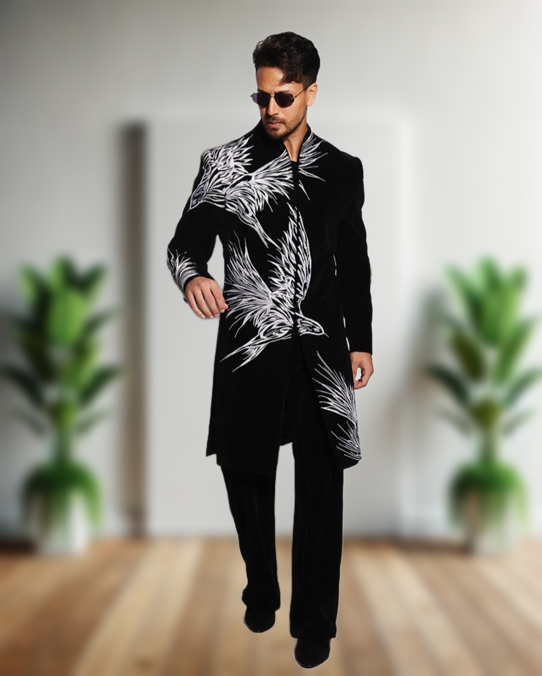 Unleash your inner royalty with the Men’s Exclusive Luxury Tiger Sherof-Inspired Designer Indo-Western Set with Intricate Embroidery and Pant by Faisaloutfits — a symbol of strength, elegance, and craftsmanship. This regal creation captures the majestic aura of a tiger, reimagined through luxurious fabrics, intricate hand embroidery, and a bold contemporary silhouette.