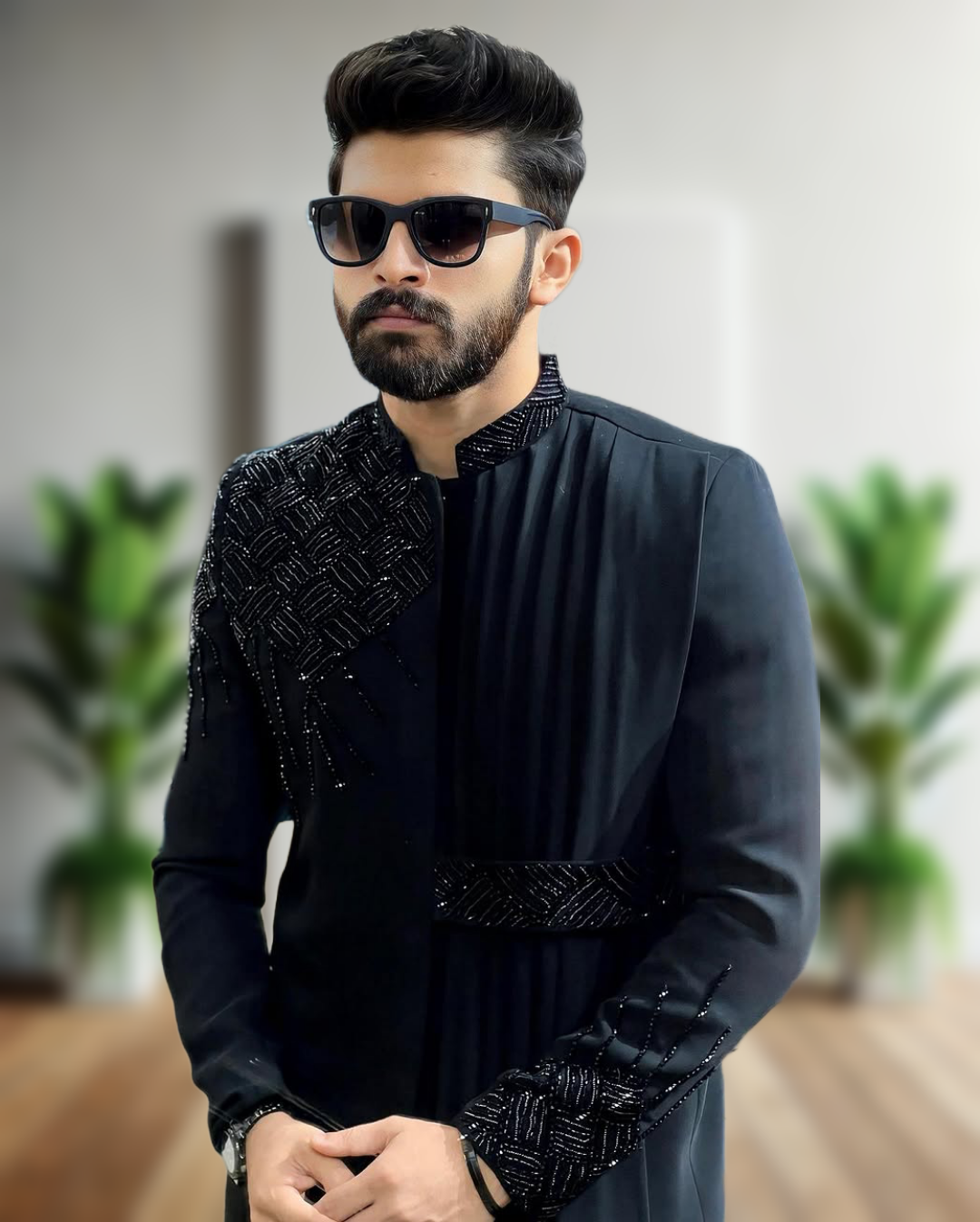 Expertly handcrafted by skilled artisans, the Bandhgala features a sharp structured silhouette with a refined dupper-style layered finish, creating a bold yet graceful appearance. The premium fabric is carefully selected for its rich texture, smooth finish, and all-day comfort, while detailed tailoring ensures a flawless fit that enhances the masculine form.