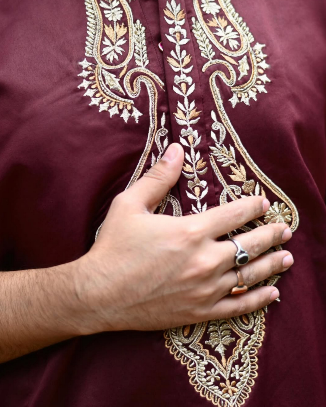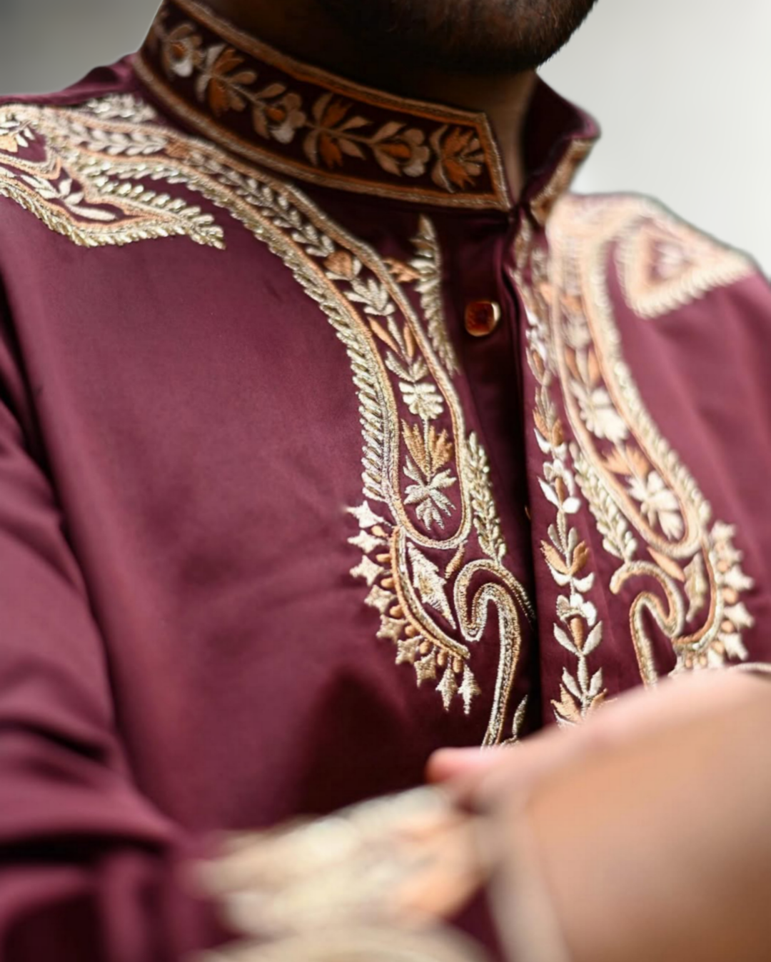This premium kurta pajama set features intricate hand embroidery, carefully placed to highlight the traditional silhouette while adding a touch of contemporary sophistication. The kurta, tailored from high-quality, breathable fabric, ensures maximum comfort without compromising on style. Its richly detailed embroidery patterns on the front, sleeves, and collar reflect a fusion of classic craftsmanship and modern aesthetics, creating a look that is both royal and refined.