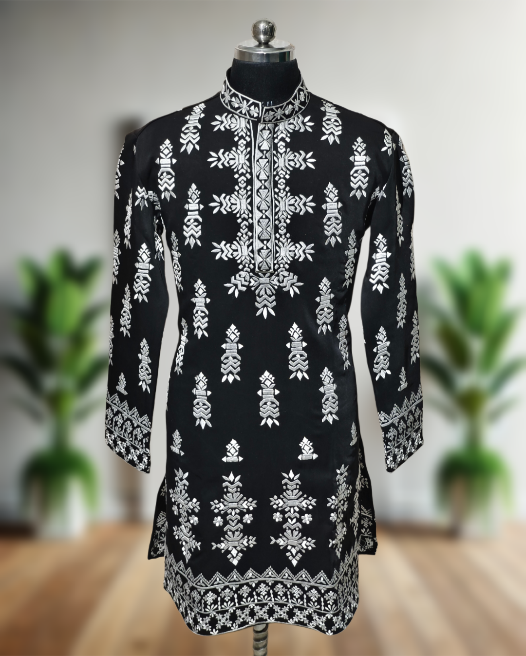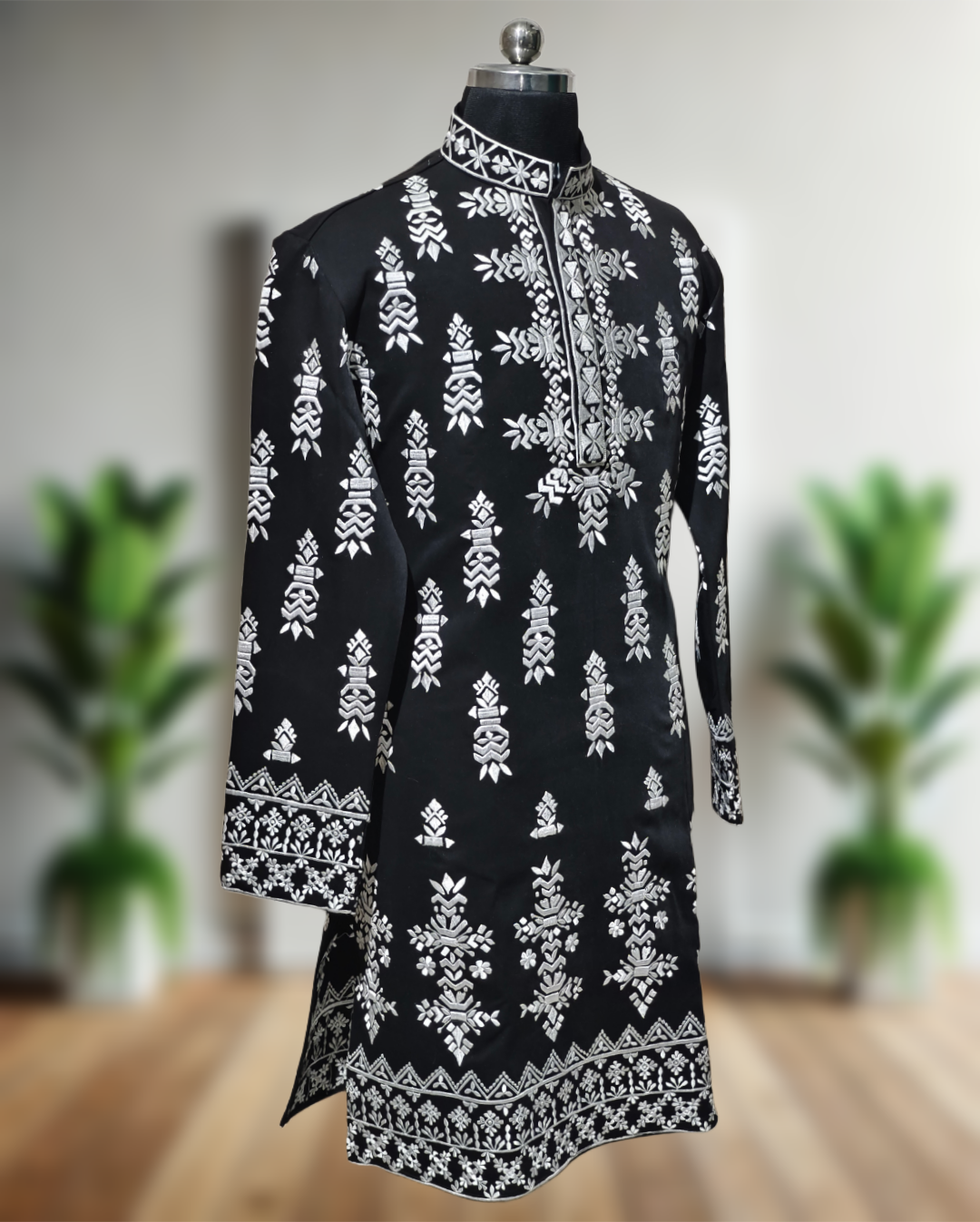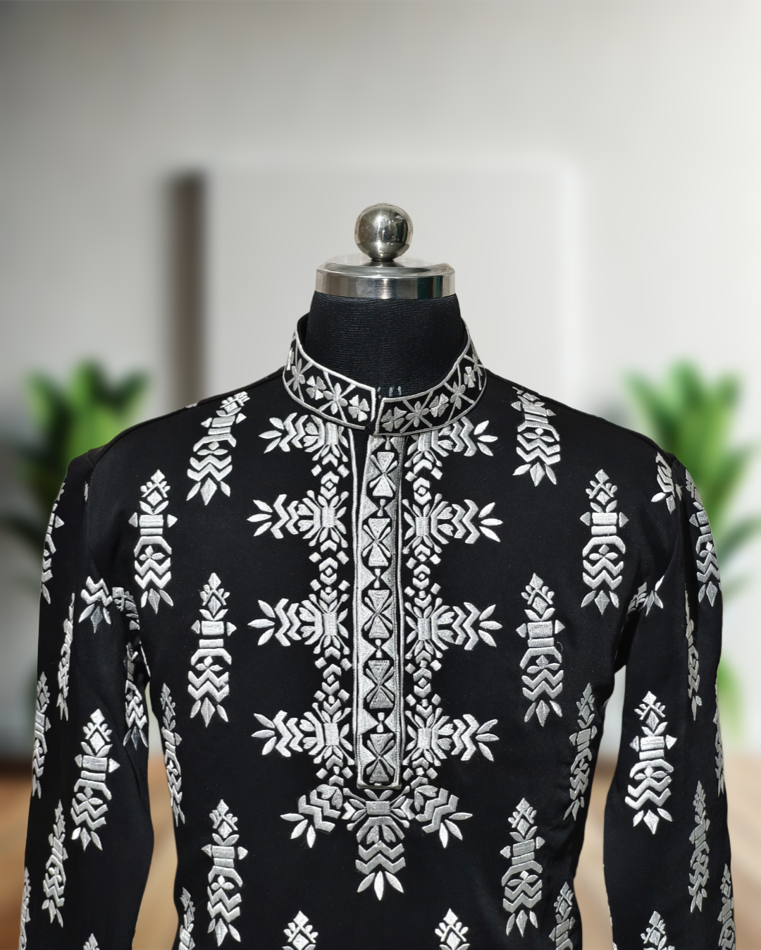 The kurta is crafted from premium-quality fabric, offering a rich texture, graceful fall, and breathable comfort for long festive hours. Enhanced with intricate embroidery work, each detail reflects fine artistry and precision tailoring, adding depth and a luxurious finish to the ensemble. The embroidery is carefully placed to maintain a refined, balanced look that suits both traditional and contemporary tastes.