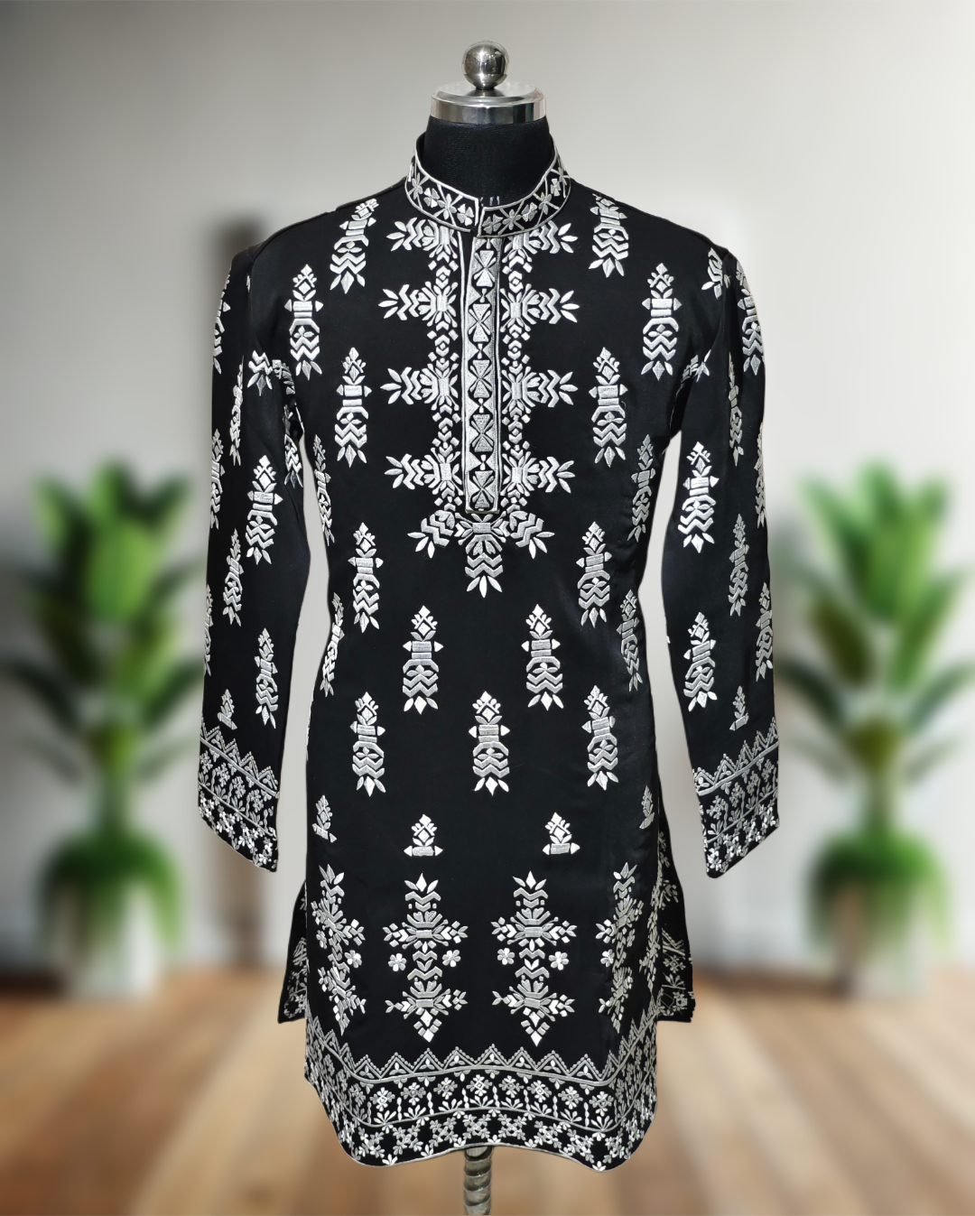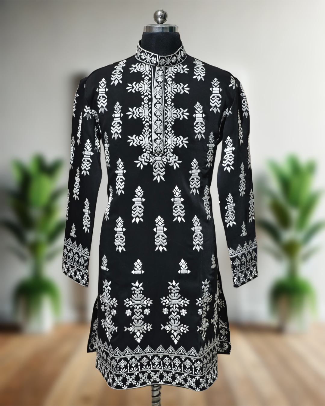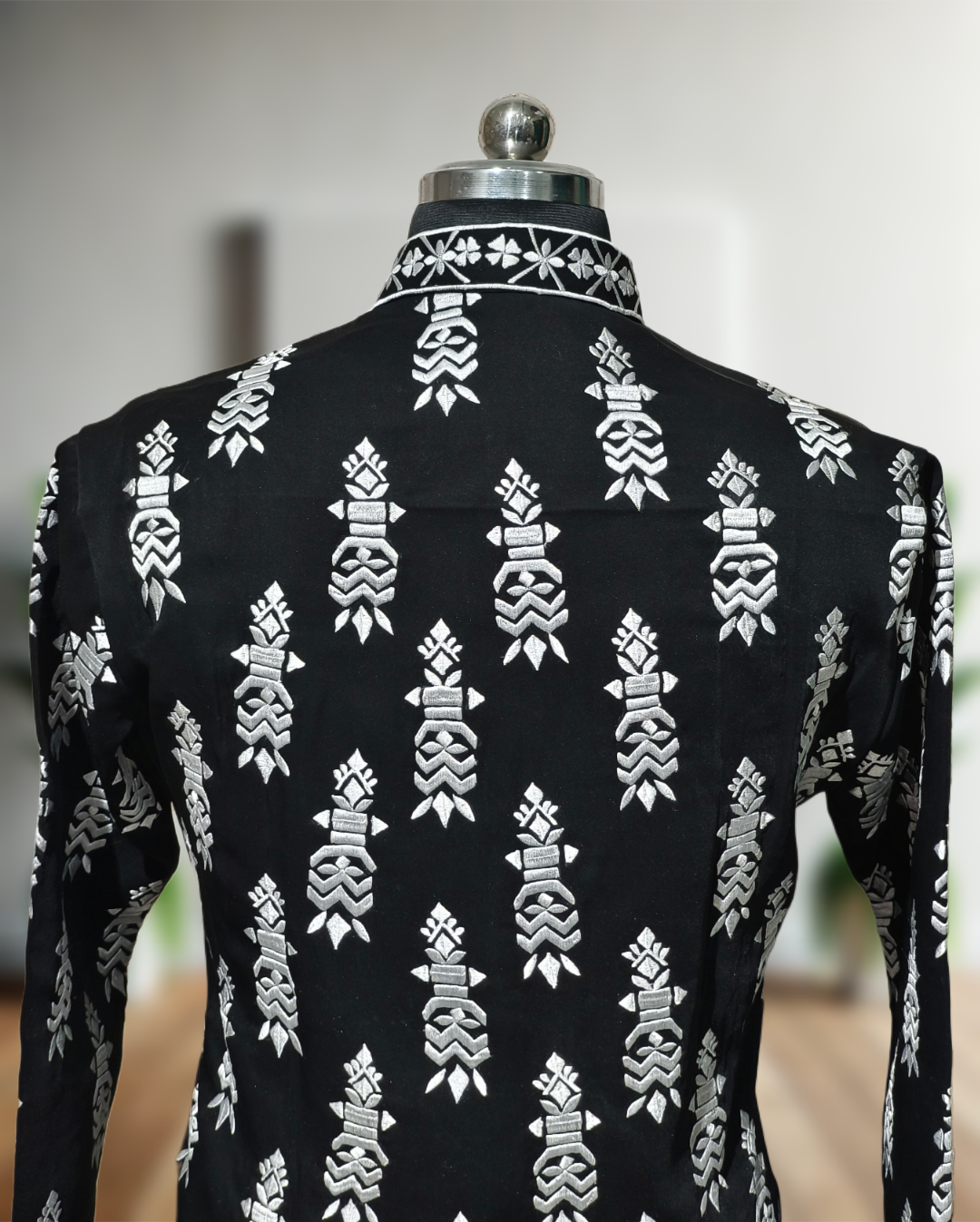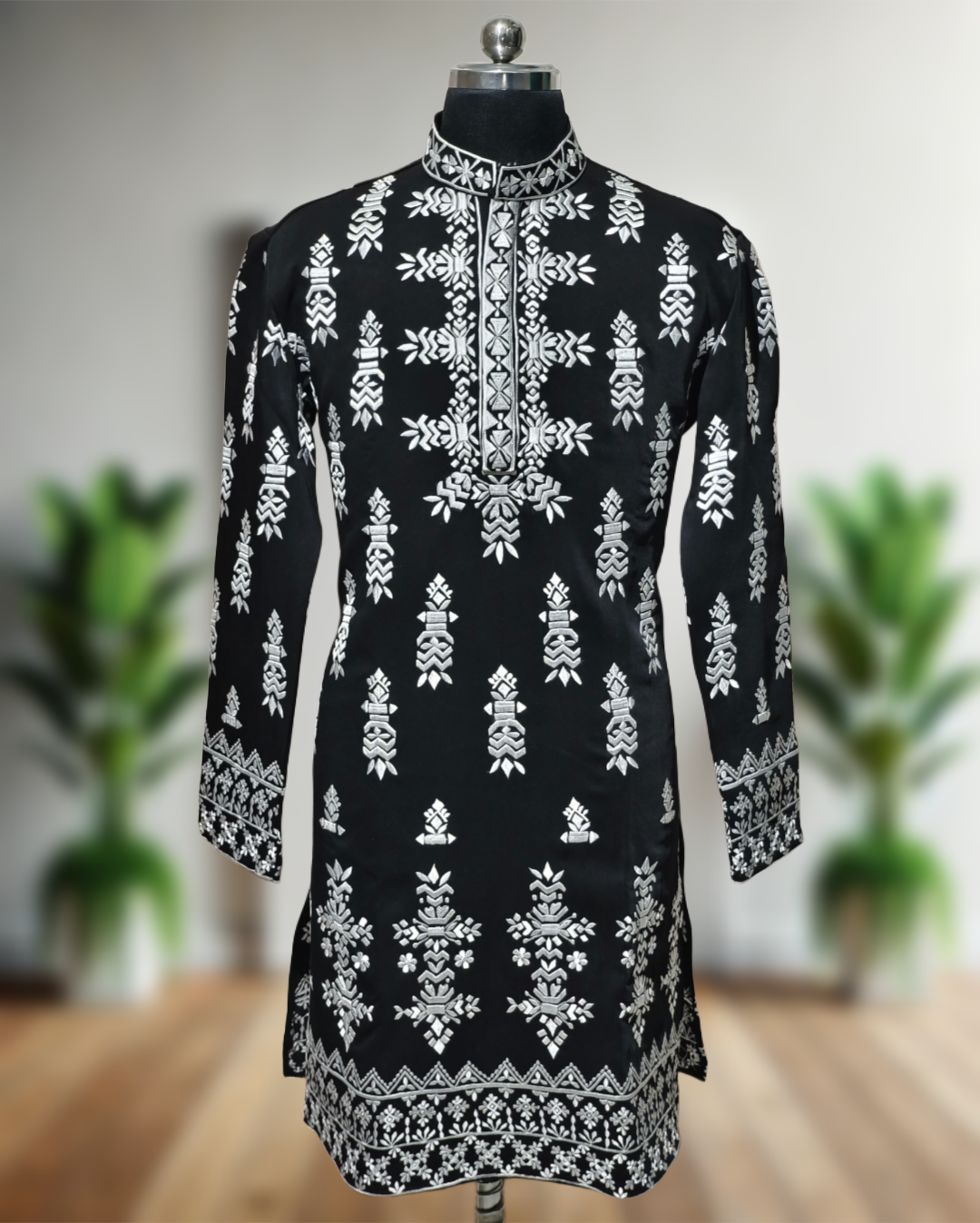 The kurta is crafted from premium-quality fabric, offering a rich texture, graceful fall, and breathable comfort for long festive hours. Enhanced with intricate embroidery work, each detail reflects fine artistry and precision tailoring, adding depth and a luxurious finish to the ensemble. The embroidery is carefully placed to maintain a refined, balanced look that suits both traditional and contemporary tastes.