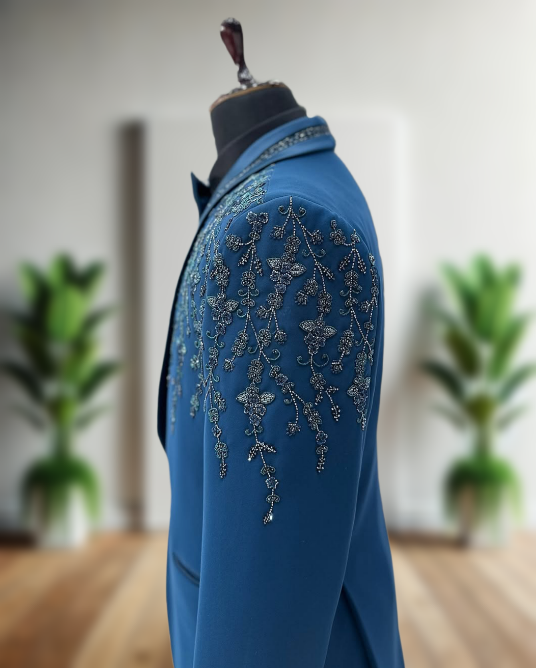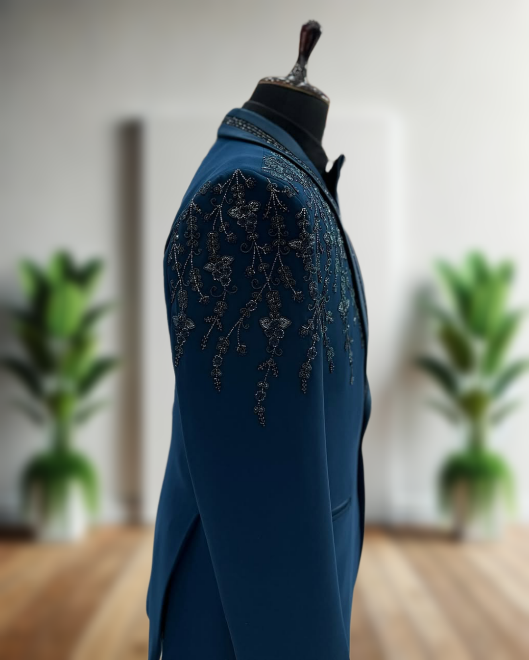 The handcrafted tuxedo blazer features a structured silhouette, sleek lapels, and meticulous detailing, delivering a sharp and refined look. Each piece is carefully tailored to enhance posture and provide a flawless fit, ensuring confidence and style in every formal setting.