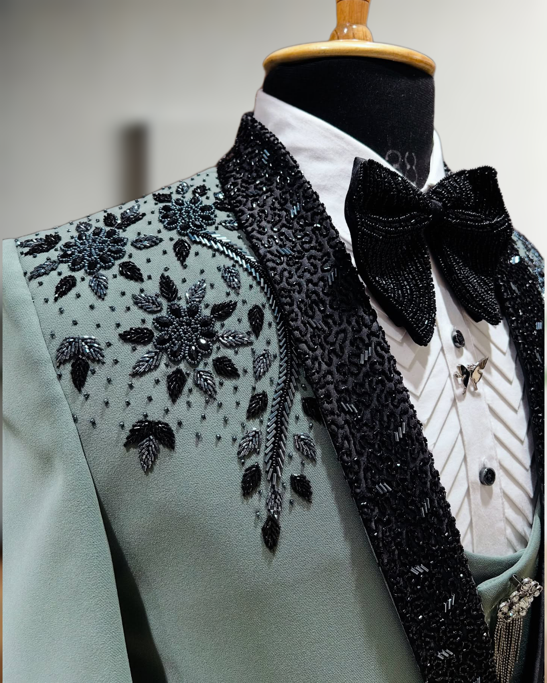 Step into the spotlight with confidence and style in this exclusive handcrafted five-piece tuxedo suit by Faisaloutfits, where modern elegance meets timeless luxury.