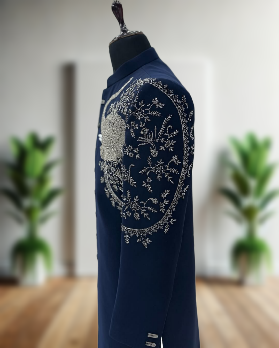 The luxury handcrafted Indo-Western jacket features refined finishing and subtle designer accents that elevate its overall appearance. The tailored pant complements the outfit with a sleek drape, ensuring ease of movement while maintaining a sharp, contemporary profile. Together, the ensemble reflects effortless sophistication and trend-forward fashion.