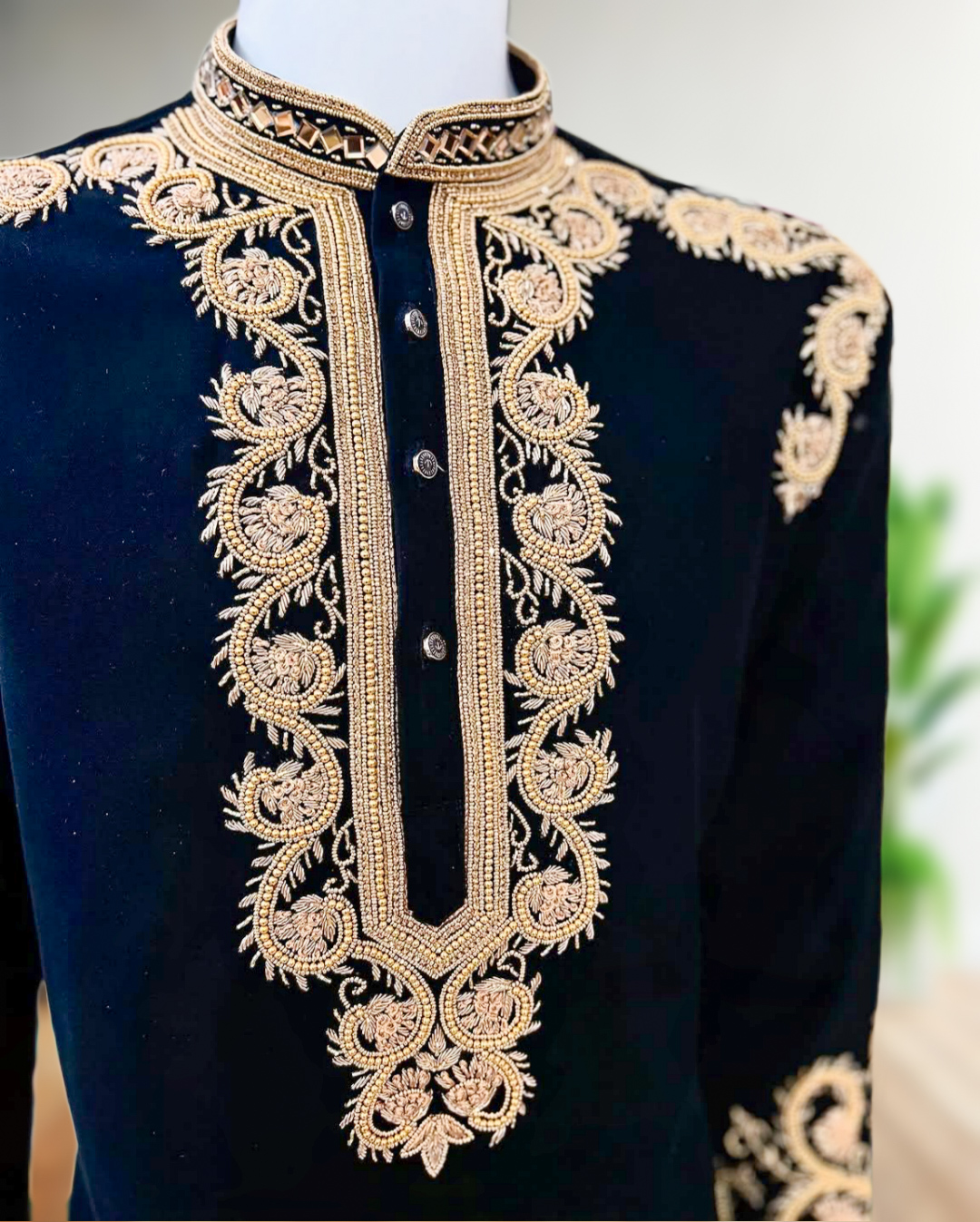 The handcrafted kurta is tailored from high-quality fabric, offering a rich texture, graceful drape, and exceptional comfort. Fine detailing, precise stitching, and a well-balanced silhouette enhance its luxurious appeal, making it ideal for long wedding functions and festive gatherings. The kurta’s elegant design ensures a polished look while maintaining ease of movement.