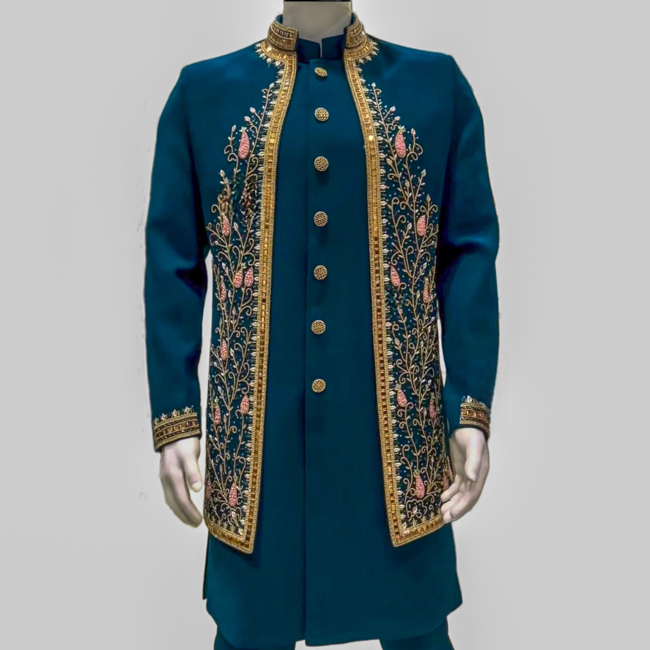 Make every occasion unforgettable with this exclusive handcrafted open shrug sherwani set, designed to elevate your festive and wedding wardrobe with grace and grandeur.