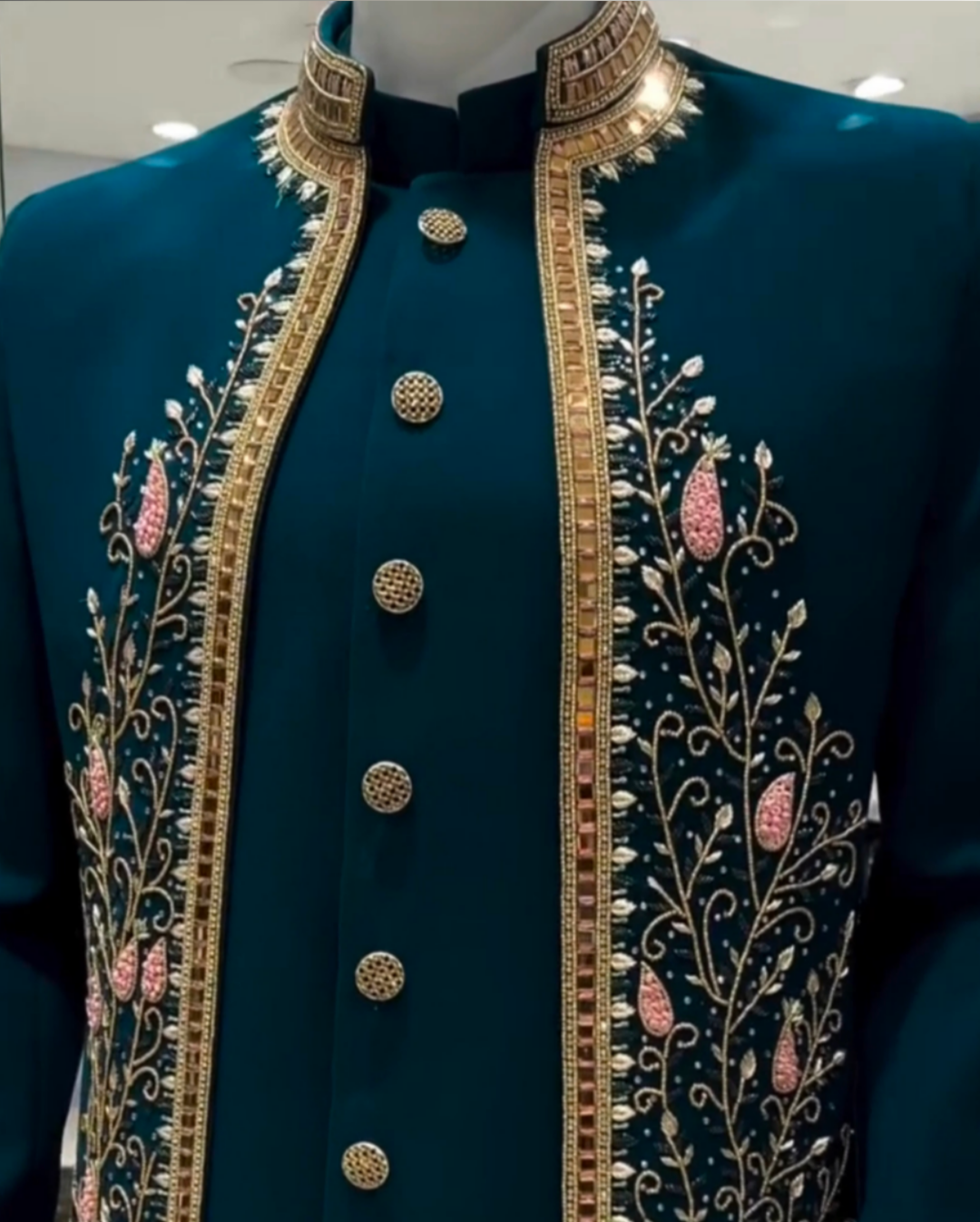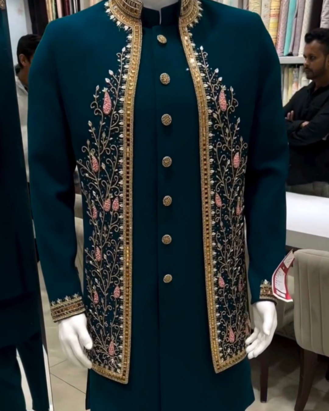 Redefine traditional elegance with the Men’s Exclusive Most Trending Designer Luxury Handcrafted Open Shrug Sherwani Set by Faisaloutfits, crafted for men who want to stand out with contemporary sophistication and royal charm. This statement ensemble blends classic Indian heritage with modern styling, making it an ideal choice for weddings, receptions, festive celebrations, and high-profile occasions.