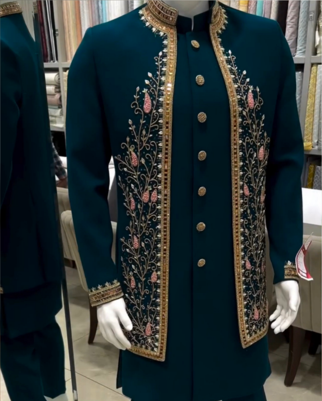 Perfect for weddings, engagement ceremonies, receptions, festive gatherings, cocktail events, and cultural celebrations, this designer open shrug sherwani set embodies luxury, tradition, and modern elegance. With Faisaloutfits’ signature attention to detail, this ensemble is more than just attire—it’s a bold expression of style and refined taste.