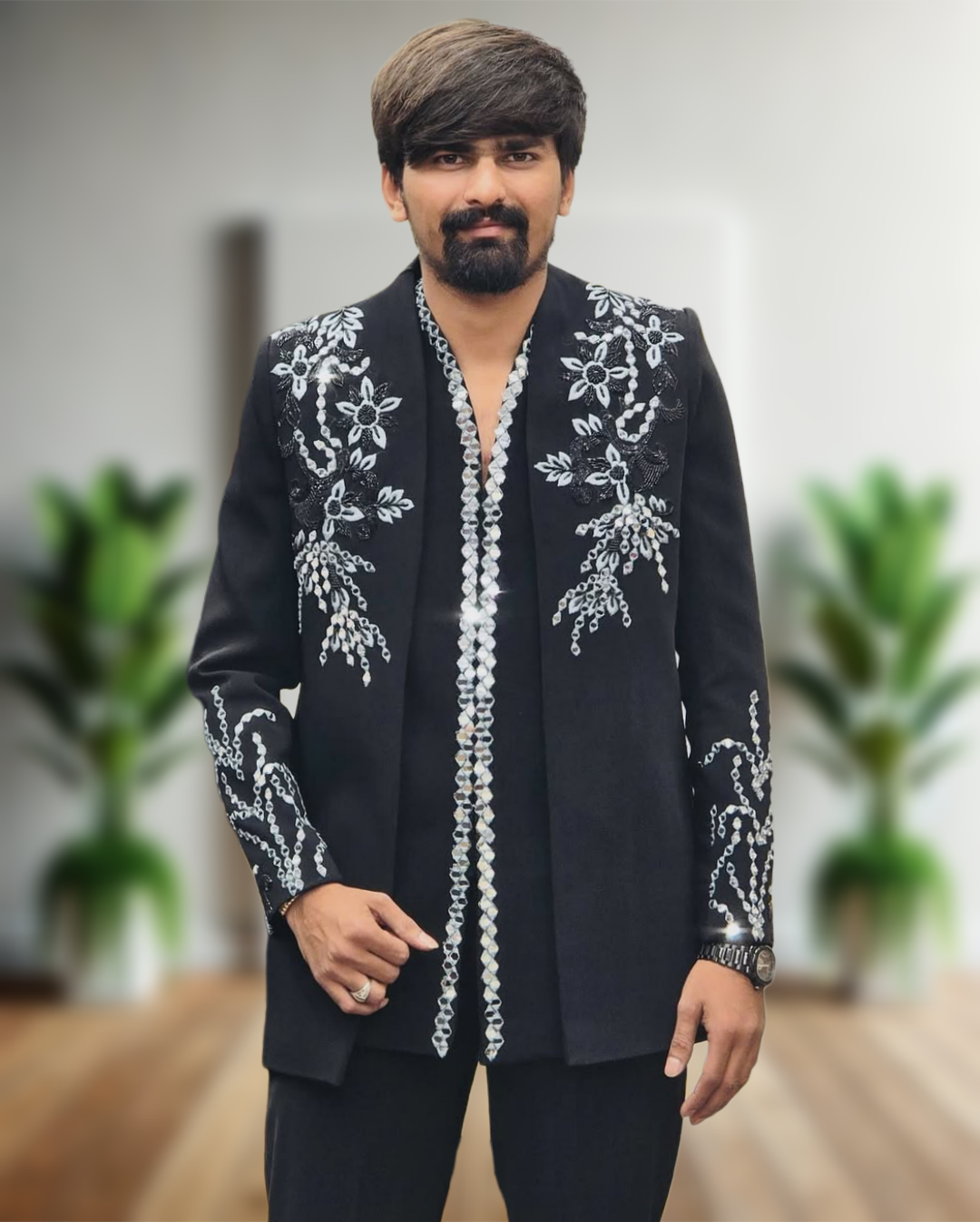 The open-style Jodhpuri jacket is the highlight of this luxurious set, featuring intricate real mirror handcrafted work that adds brilliance, texture, and a regal shine. Each mirror detail is carefully placed to enhance the richness of the design while maintaining elegance and balance. The structured silhouette, sharp cuts, and fine tailoring create a commanding presence that exudes confidence and sophistication.
