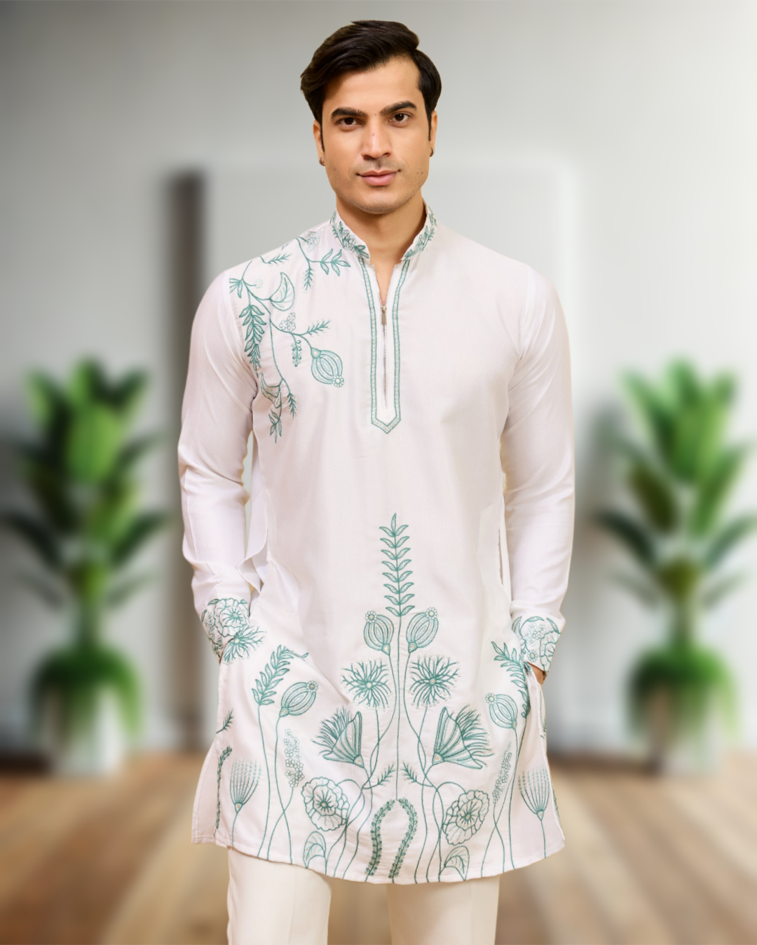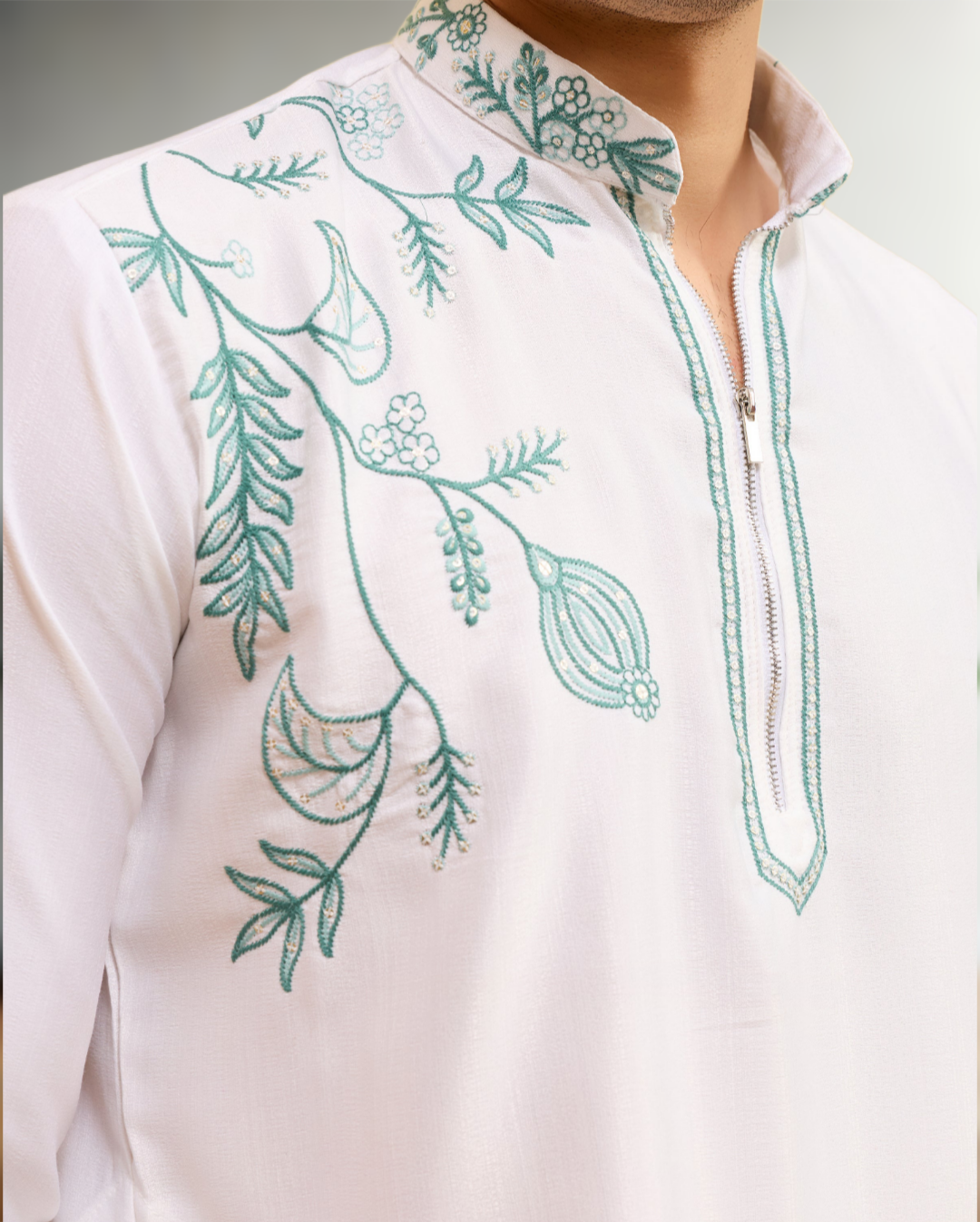 The kurta features intricate luxury thread embroidery work beautifully detailed across the neckline, front panel, and sleeves, giving it a rich and sophisticated appearance. The fine-quality fabric ensures a comfortable yet structured fit, allowing you to carry a regal look effortlessly throughout the day or evening event. The embroidery is carefully handcrafted to maintain durability, shine, and a premium designer finish.