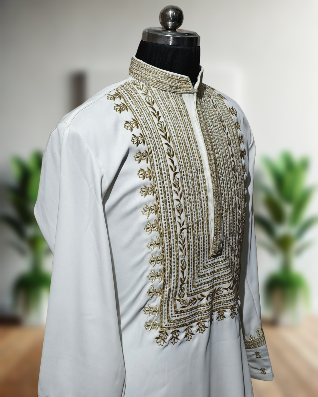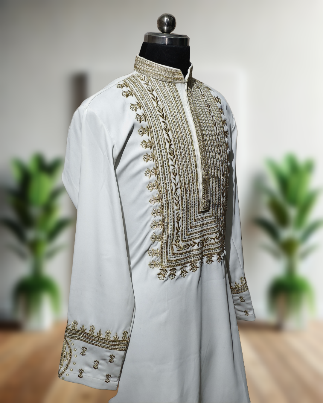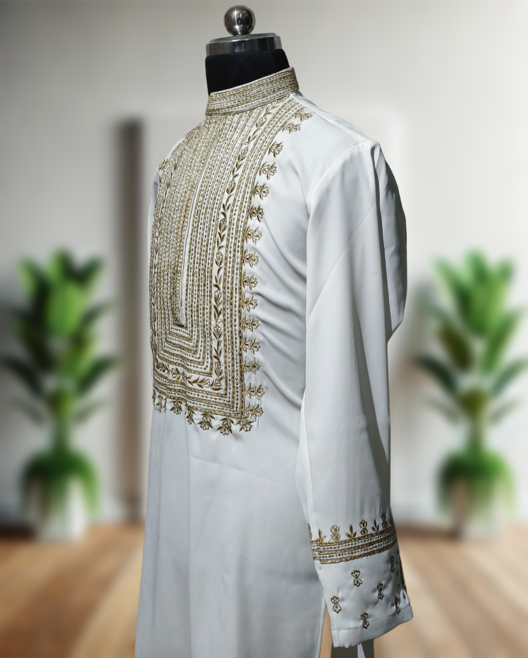 Crafted for the discerning gentleman, this premium ensemble features a meticulously tailored kurta made from high-quality fabric that exudes richness and comfort. The standout element is its exquisite hand or machine embroidery work – detailed, refined, and inspired by classic royal designs – making this outfit a true work of art.