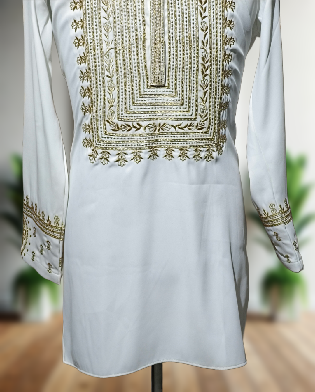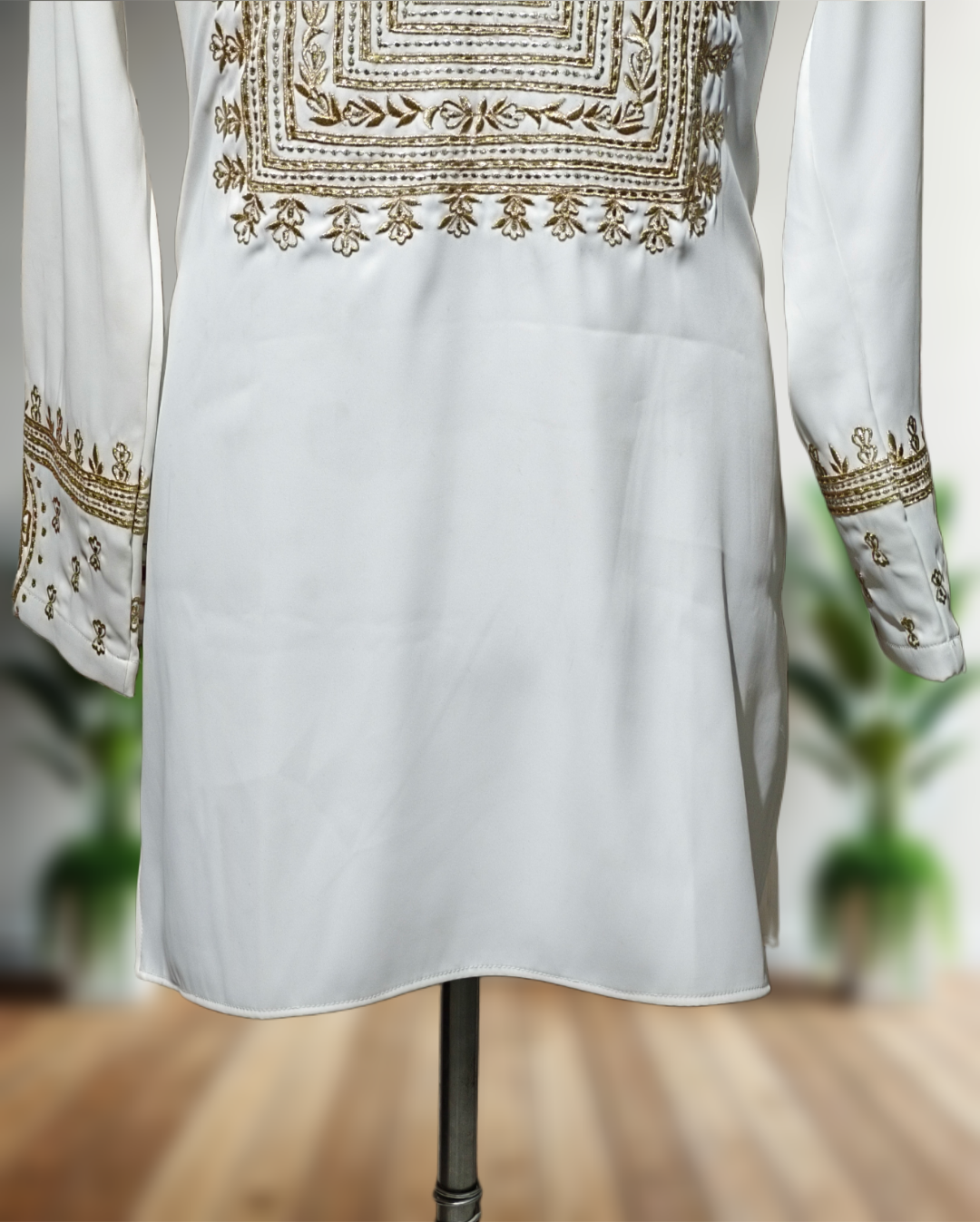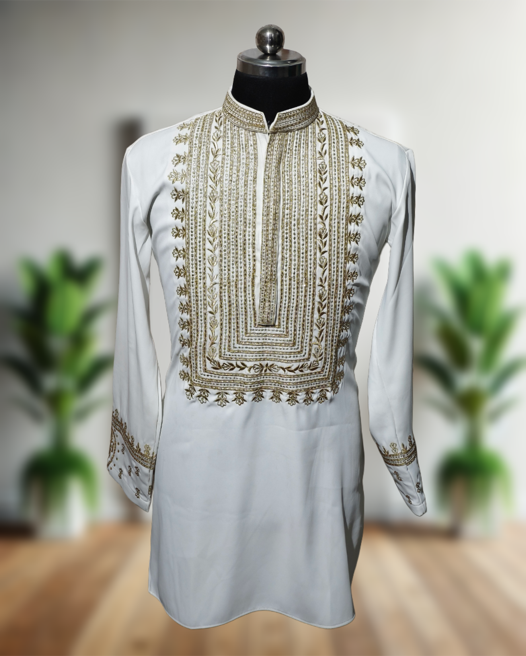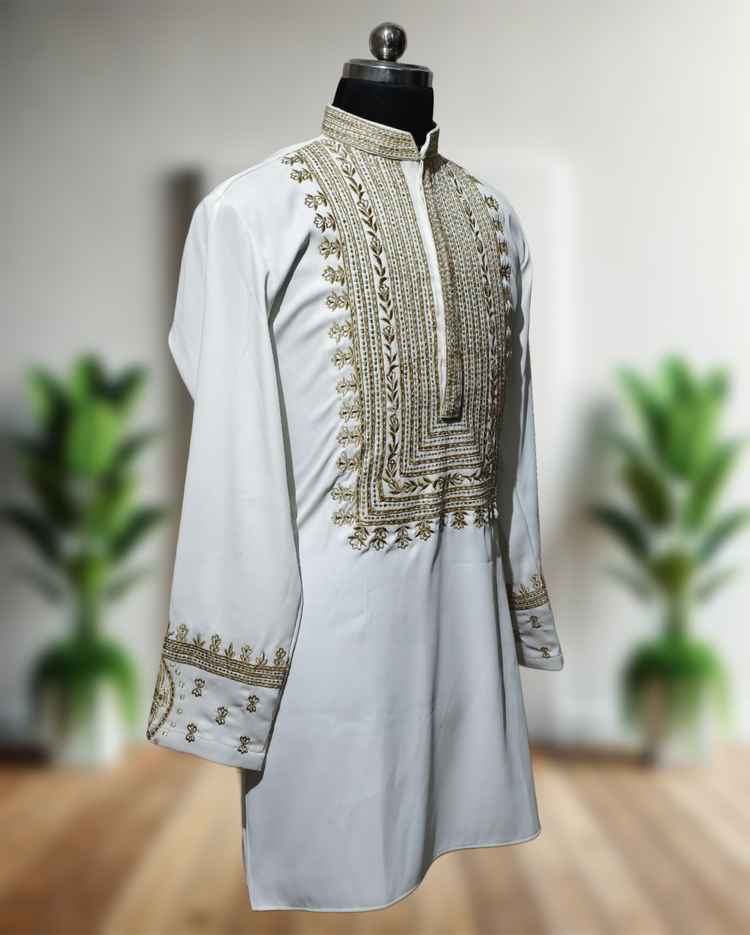 Crafted for the discerning gentleman, this premium ensemble features a meticulously tailored kurta made from high-quality fabric that exudes richness and comfort. The standout element is its exquisite hand or machine embroidery work – detailed, refined, and inspired by classic royal designs – making this outfit a true work of art.