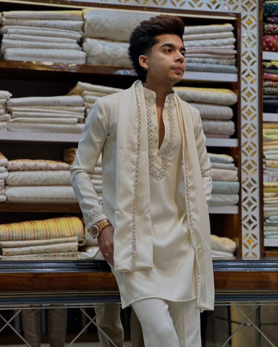 Celebrate special moments in refined style with this exclusive luxury handcrafted kurta pajama with dupatta set, designed to reflect elegance, comfort, and modern sophistication. A distinguished choice for men seeking premium wedding and festive attire.
