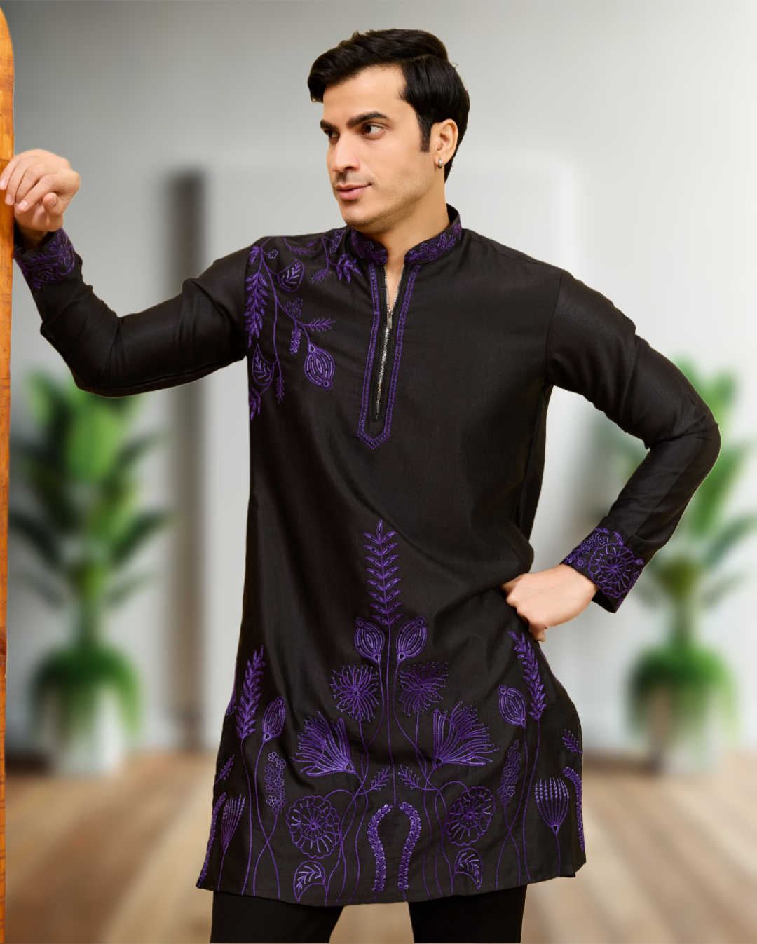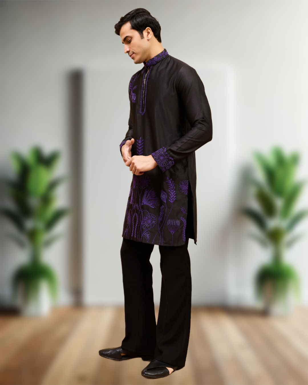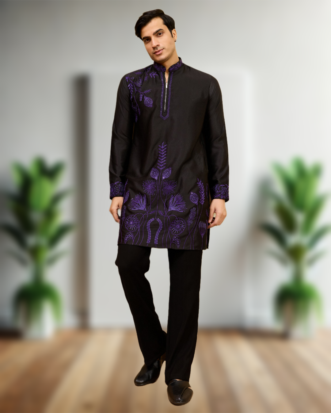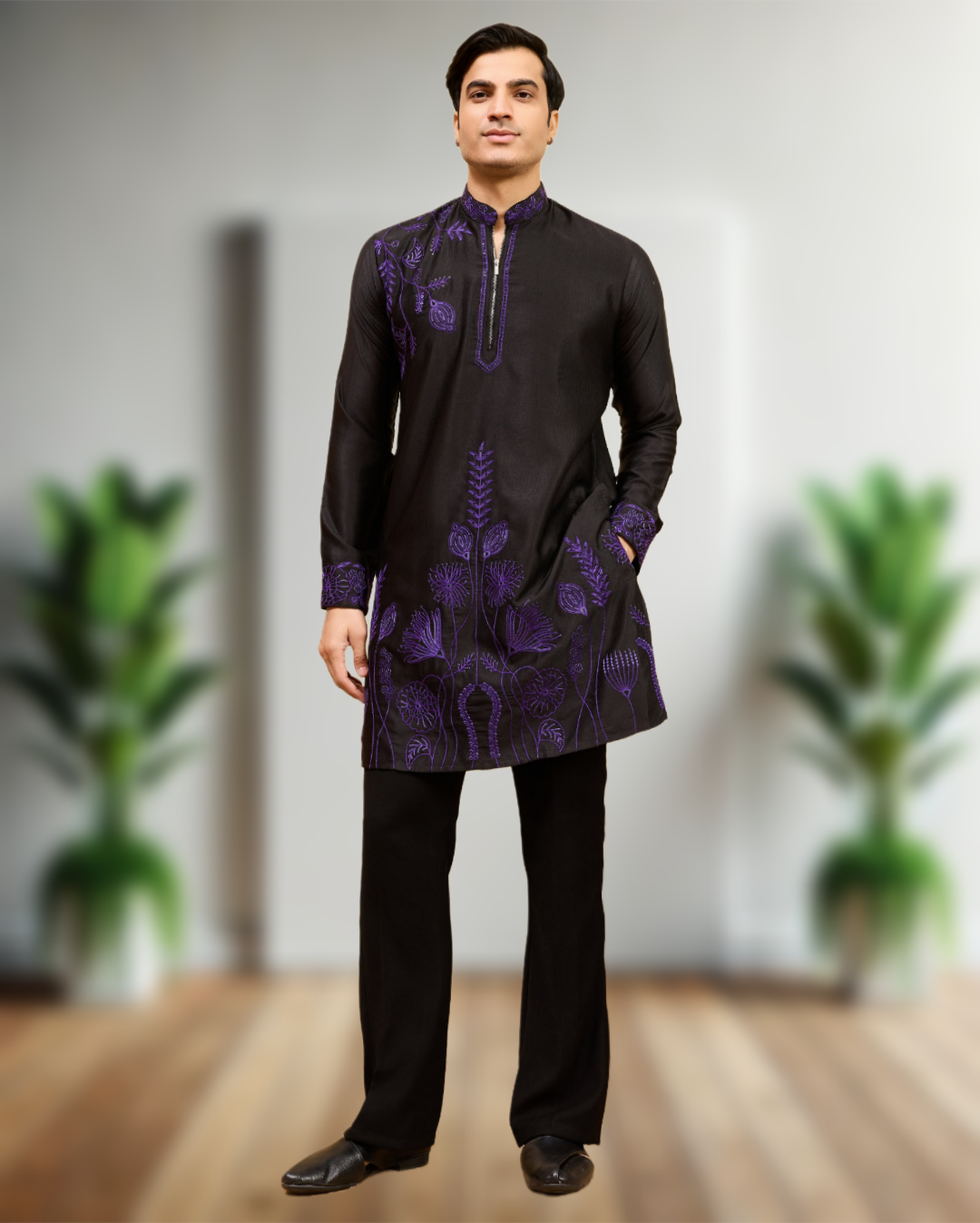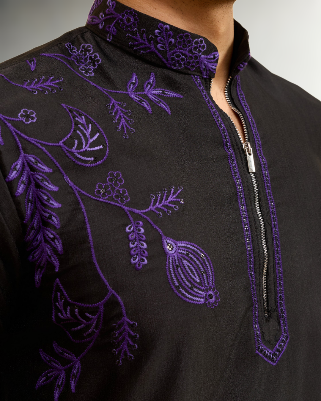 The kurta is beautifully enhanced with intricate luxury thread embroidery that showcases fine detailing and superior workmanship. The embroidery pattern is carefully crafted to add depth, texture, and richness to the overall look, giving you a regal presence at every event. Made from high-quality fabric, the kurta offers a smooth, breathable feel while maintaining a structured and sophisticated silhouette.
