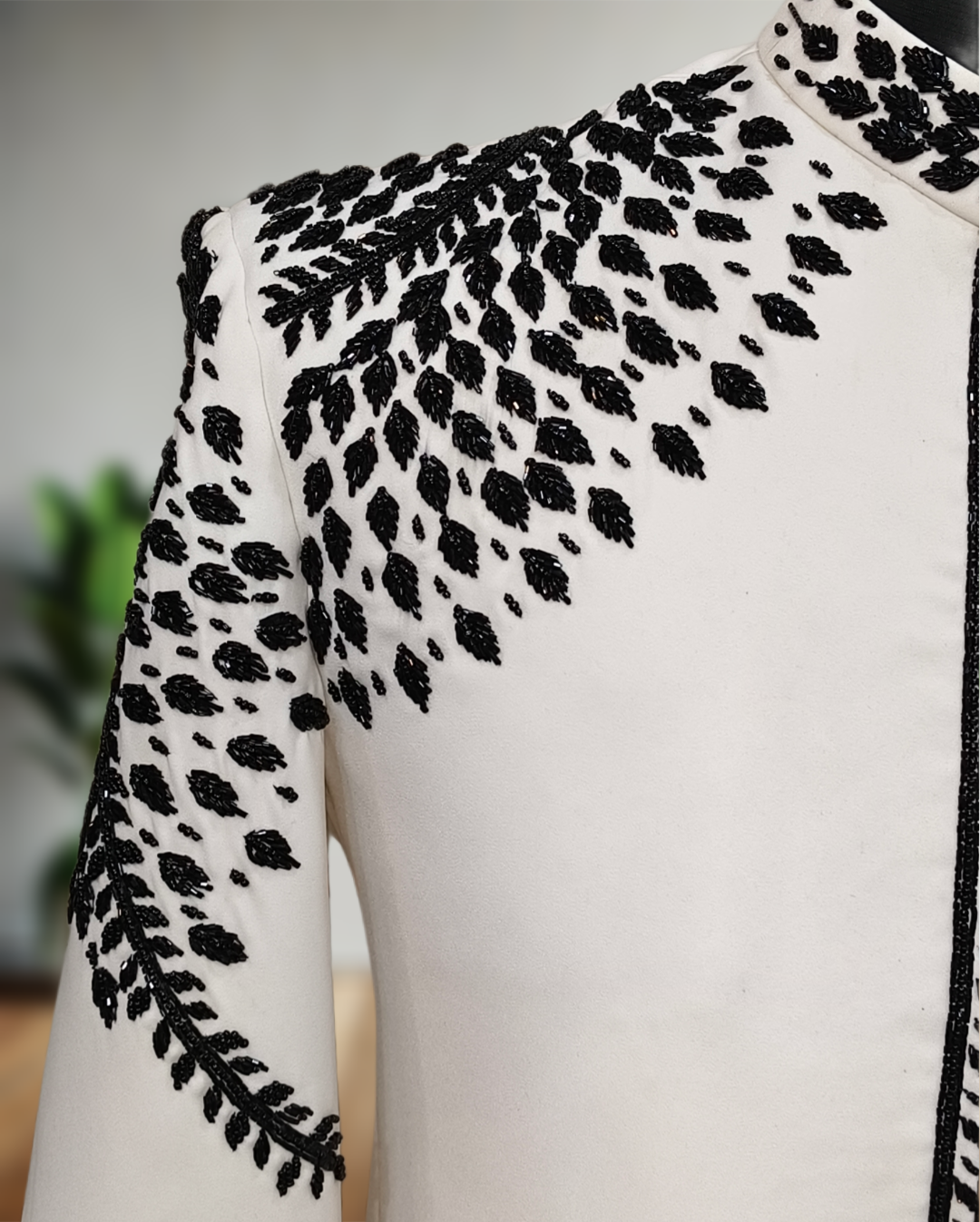 This premium designer suit features intricate craftsmanship and a modern open-front design that blends traditional heritage with current fashion trends. The coordinated pant completes the look, offering a polished and sophisticated appearance suitable for high-end events.