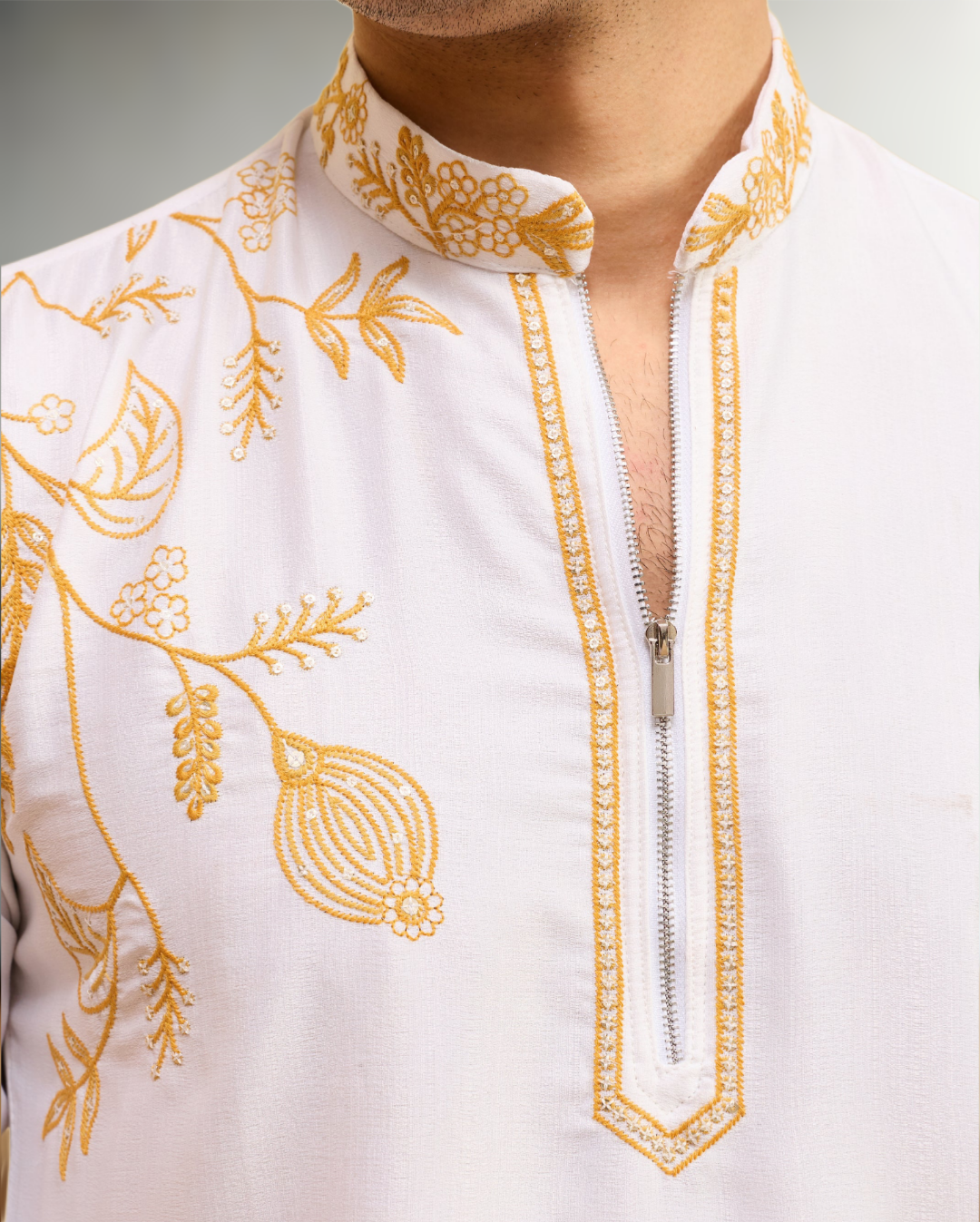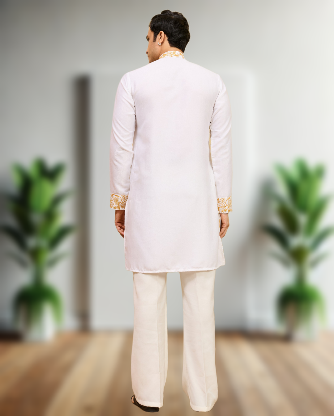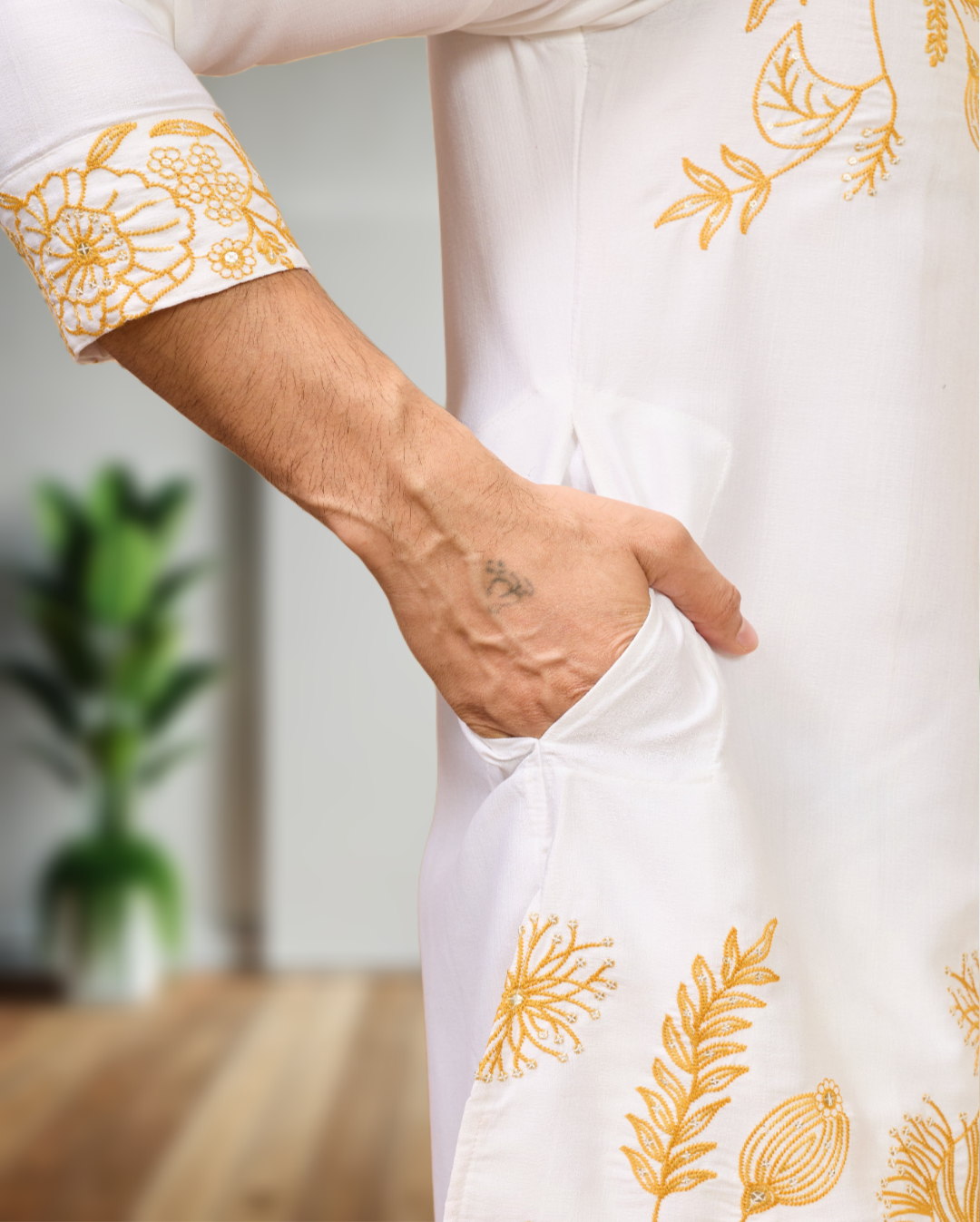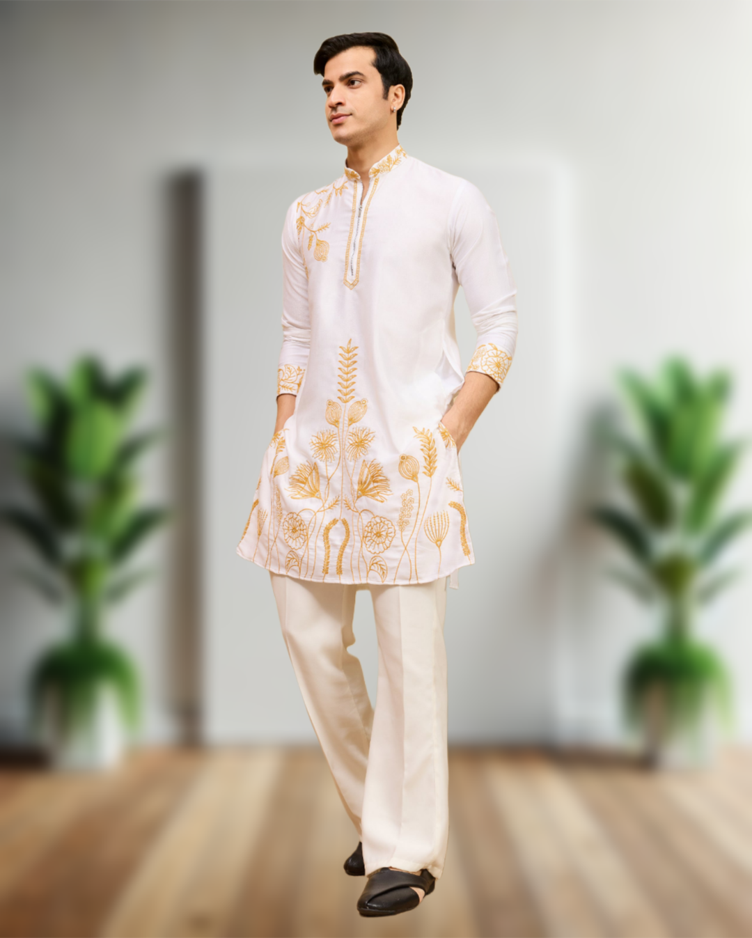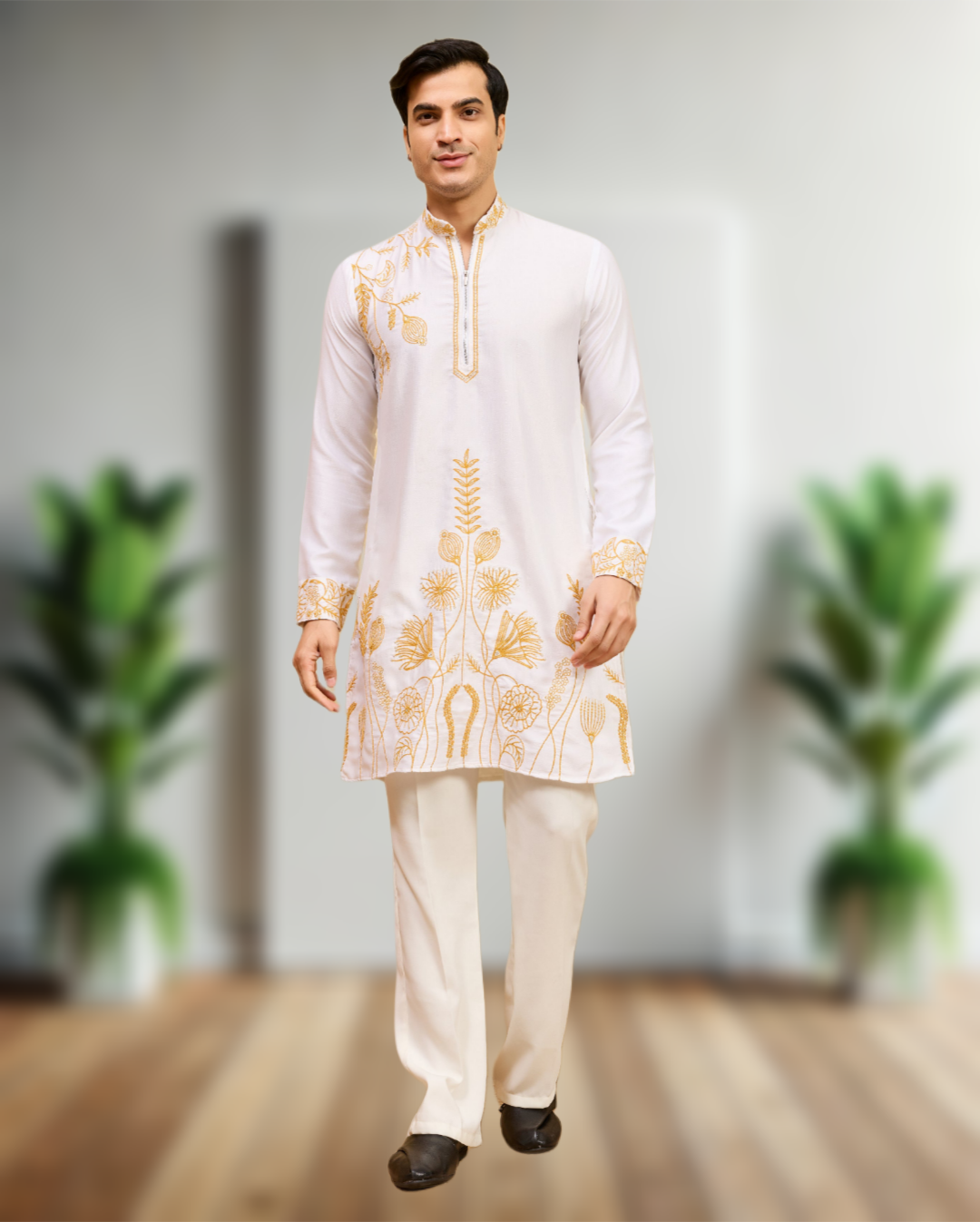 Designed with intricate luxury thread embroidery, the kurta showcases detailed patterns carefully handcrafted by skilled artisans. The fine embroidery work enhances the richness of the fabric while maintaining a graceful and balanced look. Made from premium-quality fabric, the kurta offers a soft texture, breathable comfort, and a flawless finish that ensures you look stylish while feeling comfortable throughout the day.