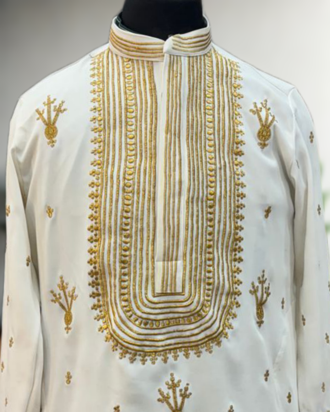 The kurta features intricate luxury thread embroidery work, adding a rich and royal touch that enhances its overall appeal. Made from high-quality, skin-friendly fabric, it offers superior comfort while maintaining a structured and elegant silhouette. The fine embroidery detailing highlights traditional artistry blended with contemporary fashion trends.