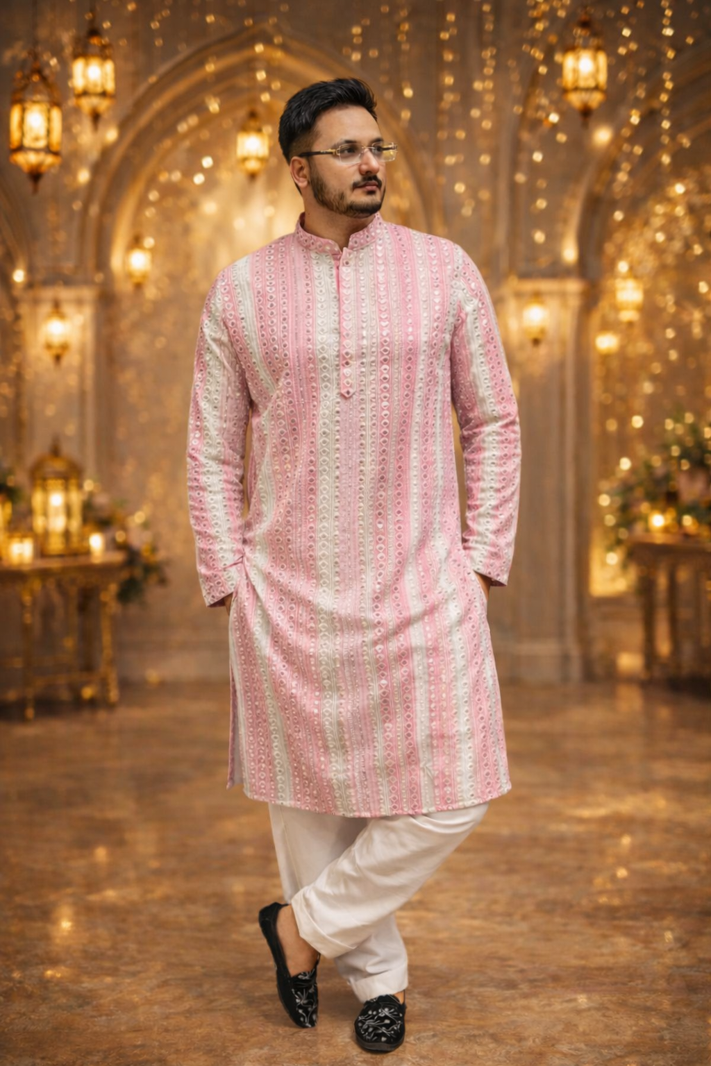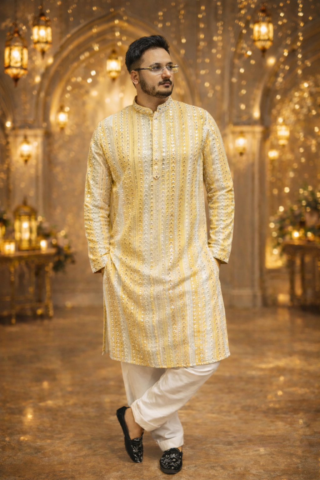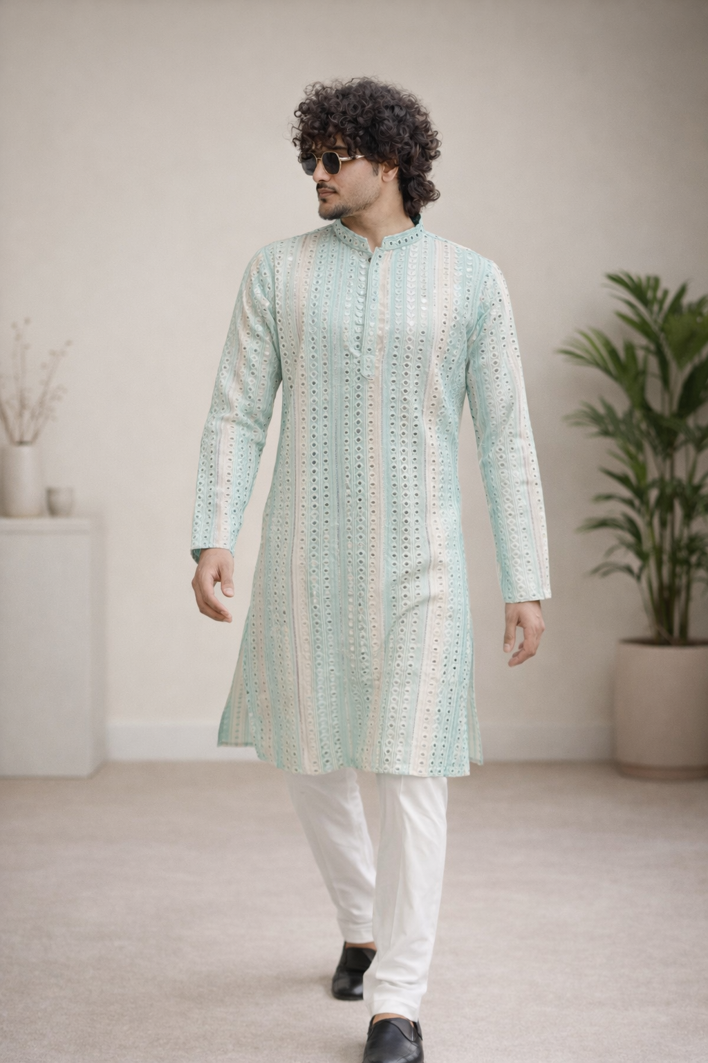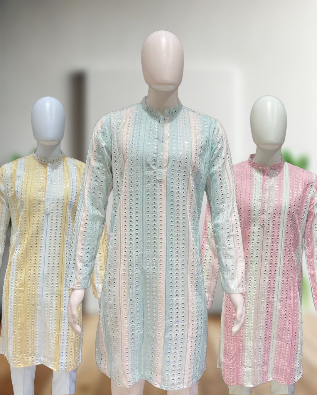 “Mirror work” refers to a traditional Indian embroidery technique where small mirrors are attached to fabric using decorative stitches. This embellishment is often seen on various traditional Indian outfits, including kurta pajamas. A kurta pajama is a traditional Indian garment for men, consisting of a long tunic-style shirt (kurta) paired with straight-cut trousers (pajama). Here’s a general idea of what a mirror work kurta pajama might entail:
